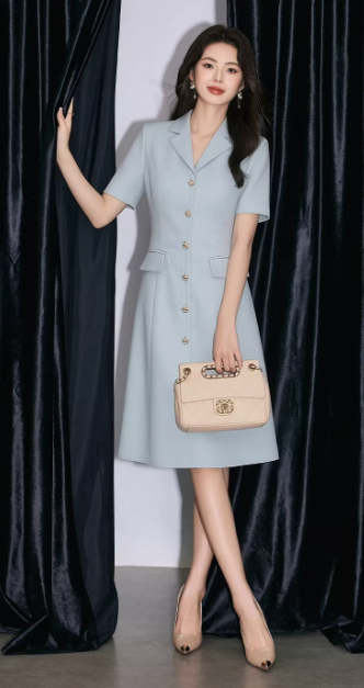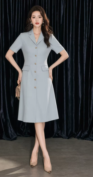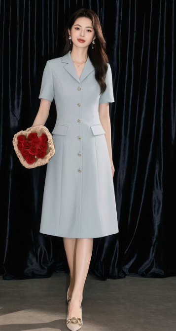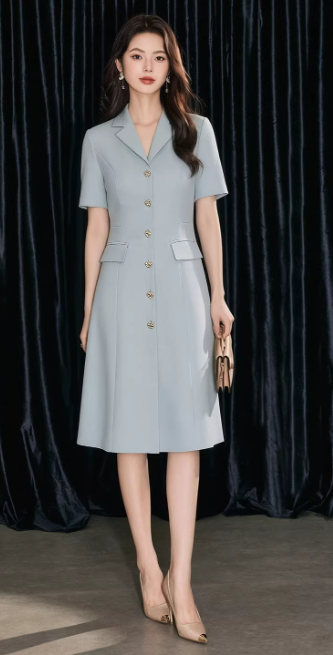 高级感雾蓝西装裙,是都市女性的气质战袍。经典西装领自带气场,收腰设计精准拿捏腰线,把干练与柔美完美融合,气场全开又不失温柔。