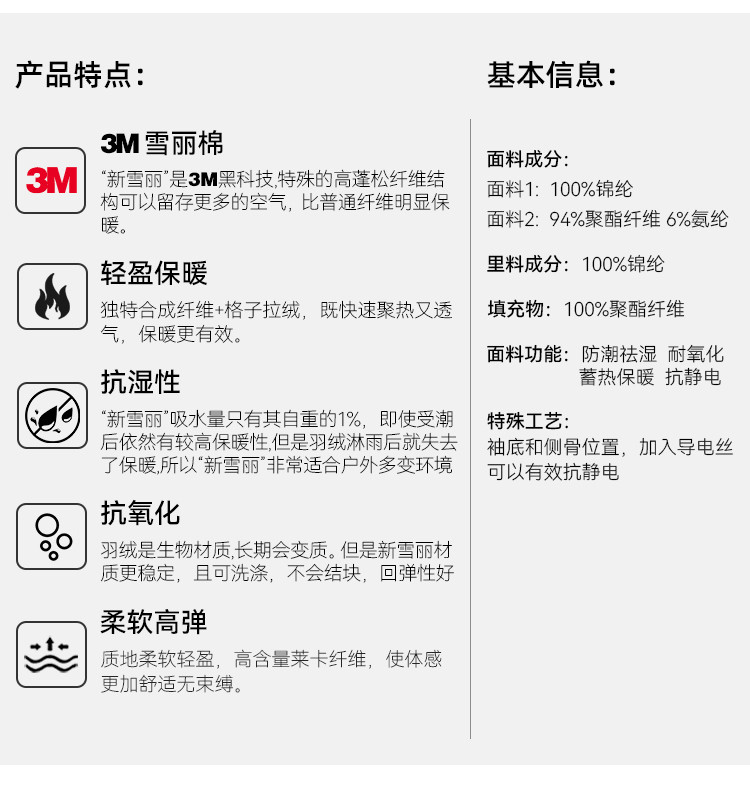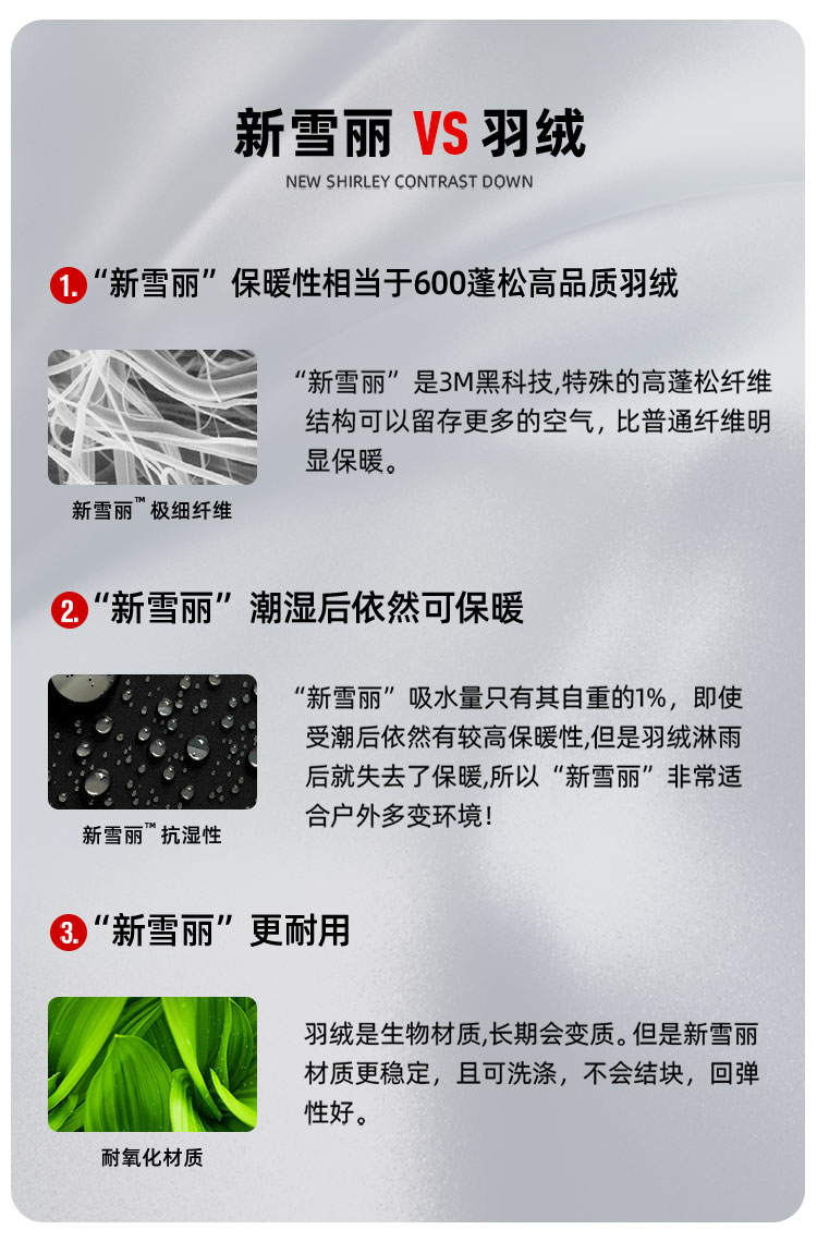 抗湿依然暖:吸水量仅占自重1%,即使遇雨雪潮湿,依然保持温暖,告别羽绒遇湿失温的困扰。