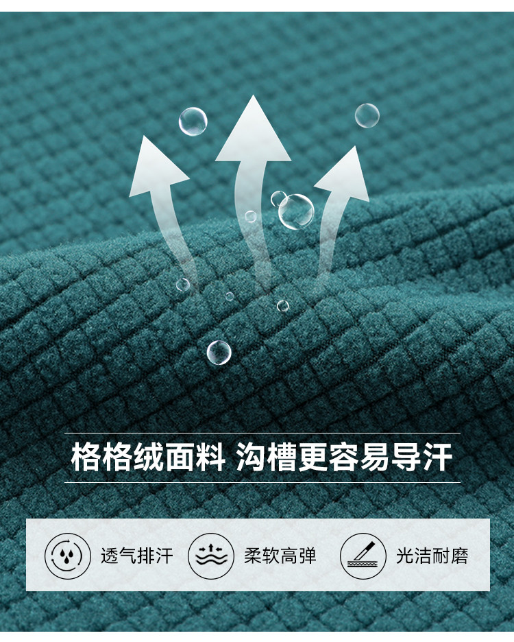 立体剪裁+拼接设计:贴合身形不束缚,侧拼格格绒面料,提升活动自由度。