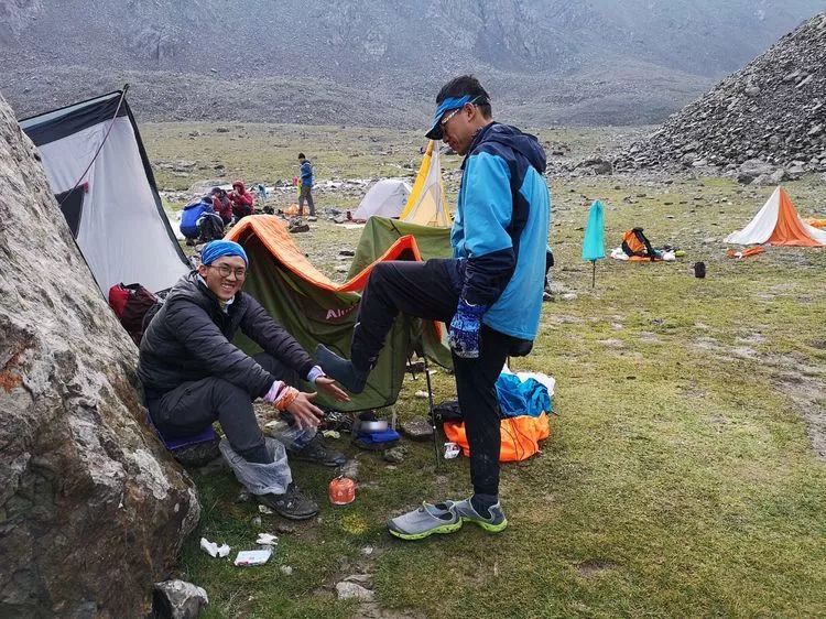 傍晚,要命的事儿发生了,四爷的包太沉,背负系统可能也不合适,三爷帮着背一路也背不动了,二十米一歇。四爷自己也走的缓慢,我留下来陪着一点点移动,身上越来越来冷,到后面只能弃包前行。到了营地,我和领队驴途老大哥,折返三公里回来捡上包,刚哆嗦着搭好帐篷,雨就停了。这就是雪山对我们的欢迎仪式!