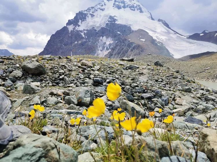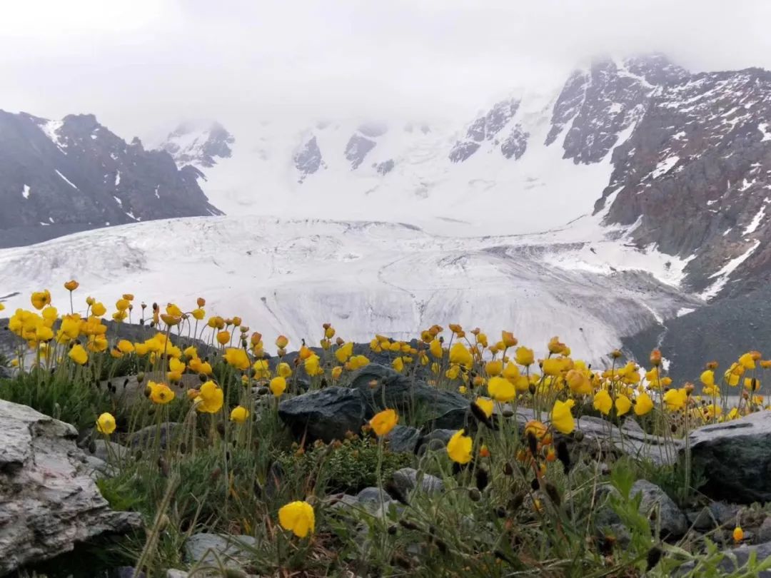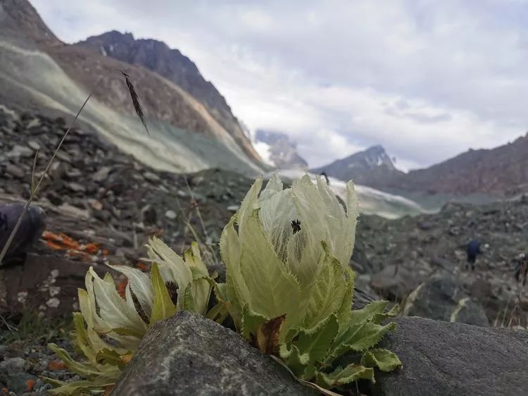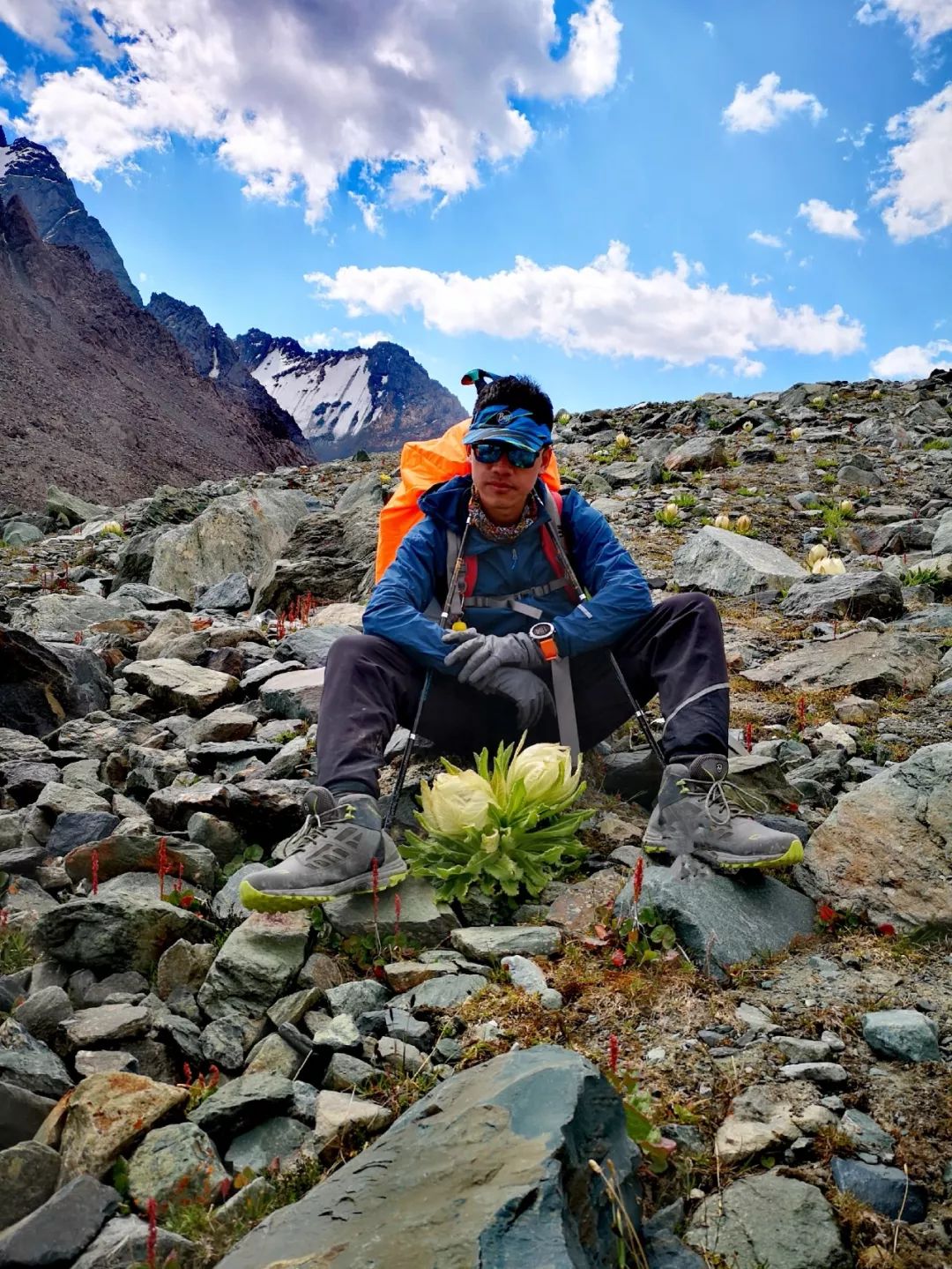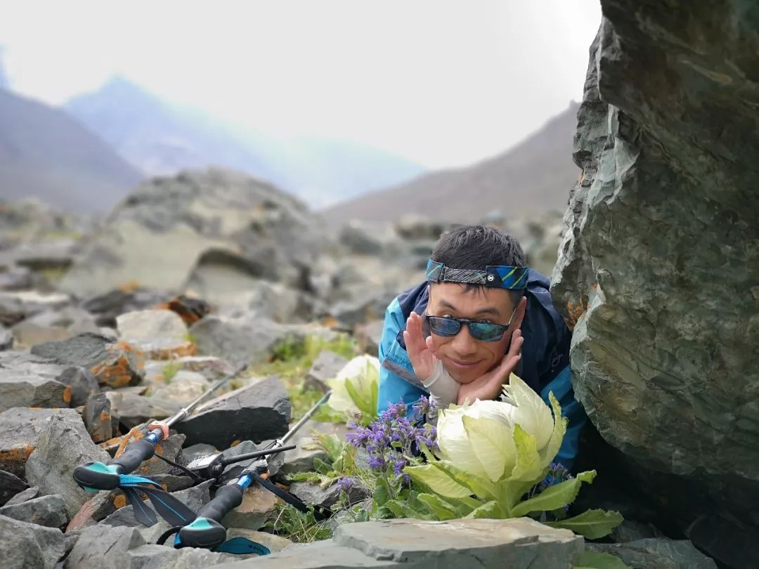 雪莲!在冰舌和岩石混合地带,盛开了好多雪莲花。原来离我们昨天两公里的地方,就有这么多大白菜!合影的同时,我把这消息通过手台,告诉了下面等马匹的俩老哥。现在想来这是在刺激人家啊