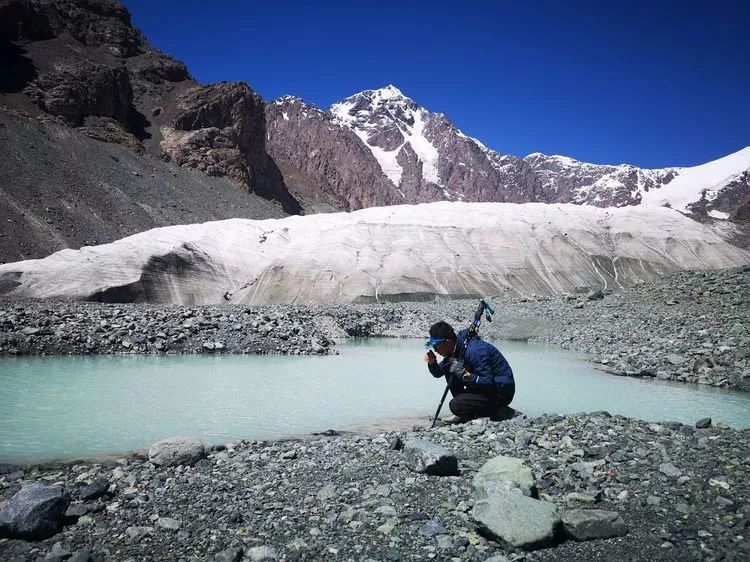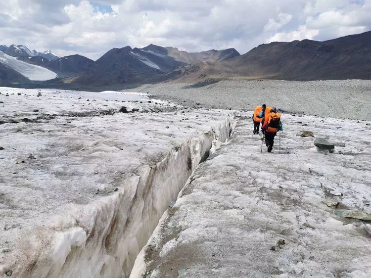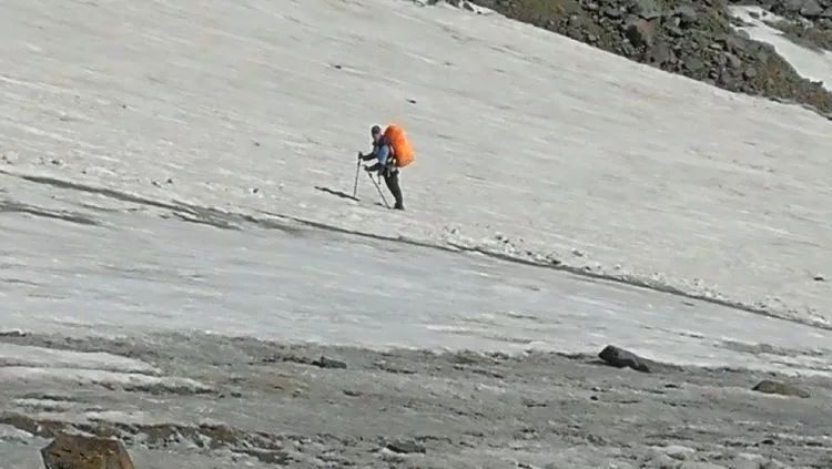 最遗憾的事还是发生了,俩个同来的兄弟,因为高反和体力问题,只能选择骑马下撤,我犹豫了一下,选择独自前行。握手告别后,我们继续踏上未知之旅。过河,爬升,很快第一次踩到了冰川上。