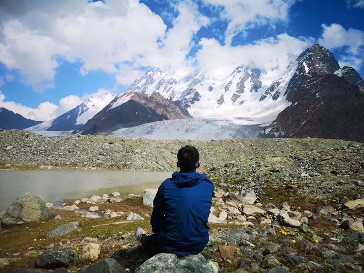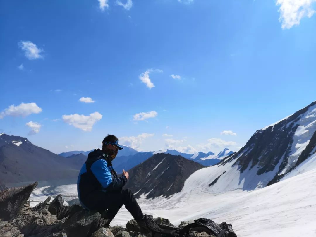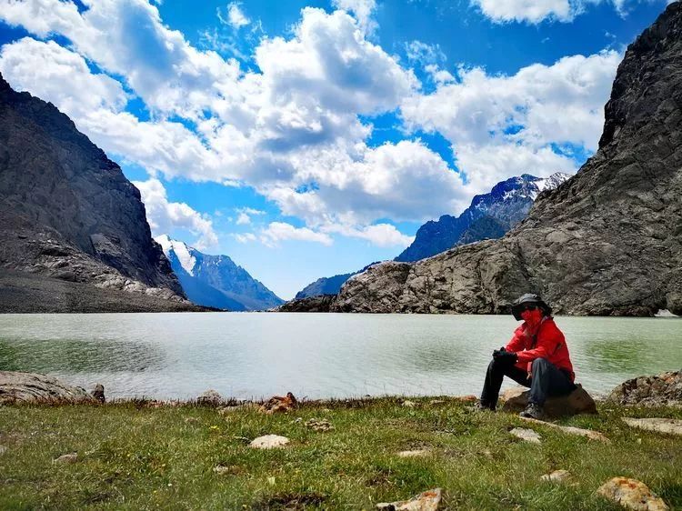 美景使人心情开朗,我和甘甘边拍照,边等非文。没有手机,我更全情的投入到了徒步中,前两天的经历,只能当作是天意了,就把我的手机和里面的一切,永远冰冻在博格达峰上吧!