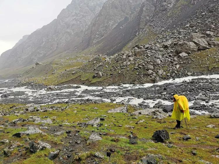 果真是上了海拔,天气说变就变,午饭后小雨开始飘了下来,换上雨衣,继续行走在陡峭的峡谷碎石上。过了峡谷,到了草地,已经下成大雨,脚下深一脚浅一脚,身上感觉已轻度失温…