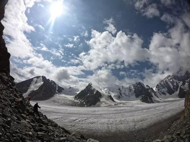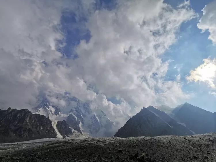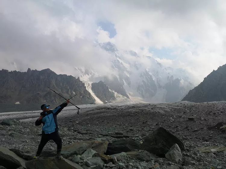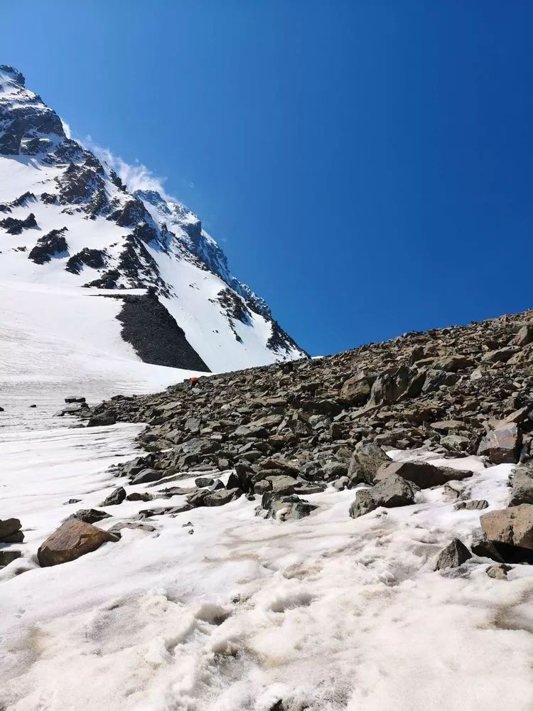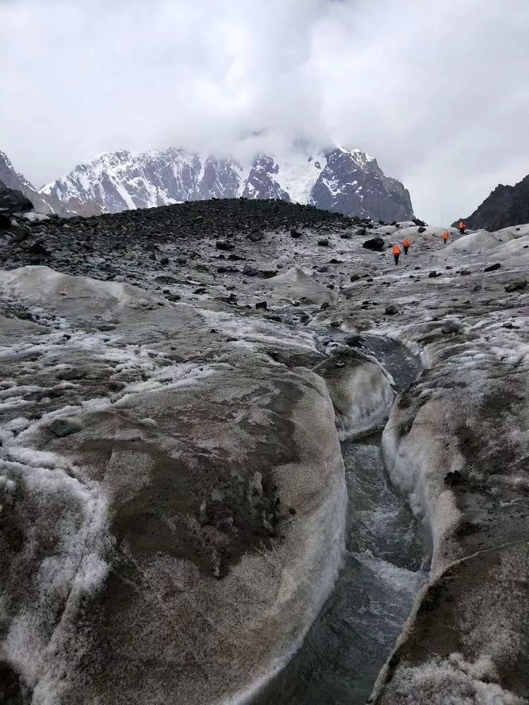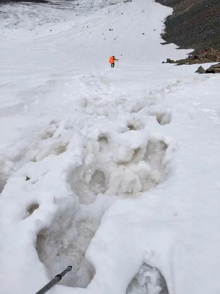 之后一路布满冰裂缝的冰川,上面还有各种黑色大岩石,如同来到月球表面。日本登山队员白水满子,登顶博格达下撤后,就掉在了里面,当时还没有死,只能喊我冷我饿…但是也无法被救上来,多年后尸体才被冲出,衣冠冢就在大本营。后来又聊起严冬冬,也是走着走着,人就没了…