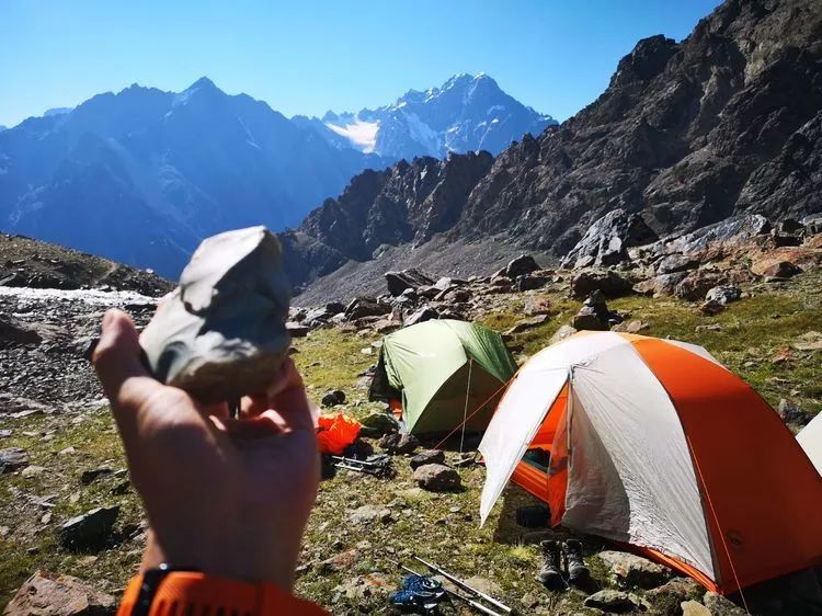 饭后,我们开始在河边捡石头,有的确实里面包着白色的东西,领队说有水晶。有的开始玉化,我们捡了扔,扔了捡,总觉得还有更好的。最后我挑了块大的,塞进包里,感觉比三瓶水还沉(给俩老哥也捡了块,后来太沉就扔在营地了,其实就是留念,不会值钱的)。
