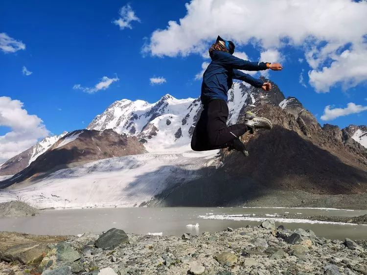 驴途说,我10分钟能到底,我俩就开始跑着下山,飞到一半实在追不上了。我在马道上脚都疼,不知人家怎么直上直下的。后来驴途掀起了裤腿,看到强壮的小腿上,布满了伤疤,才知道大神都是血和汗练出来的!之后又是靠领队的经验,过冰塔林,跳冰河,每每化险为夷,两个小时后,终于来到了冰川之下。