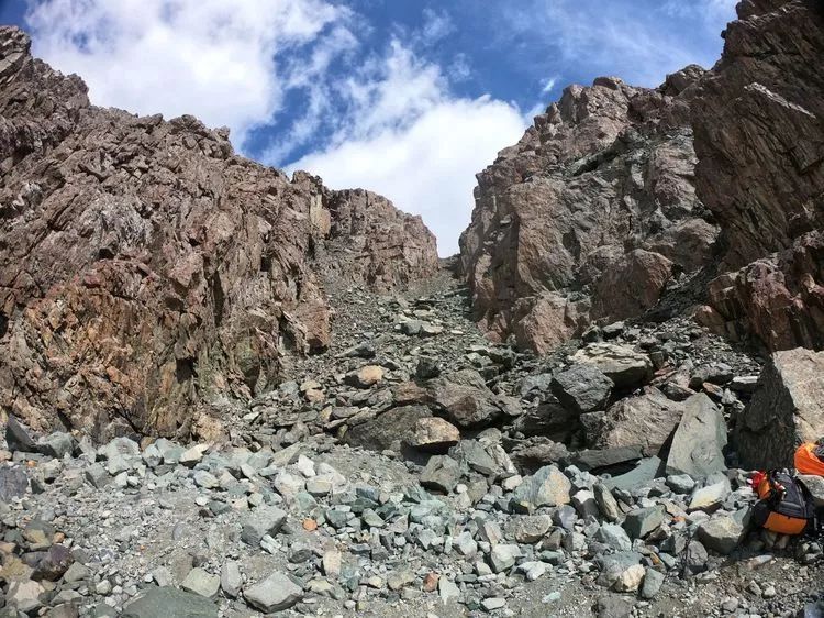 通道尽头有两个垭口,都是六七十度的碎石陡坡,有小二百米高。一个翻过去少走一天路,但是B面下坡非常之陡(后来看到,很吓人)。另一个就是我们要翻的老虎口,口如其名。深呼一口气,干!
