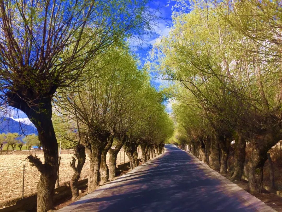米瑞乡道,春天的杨柳鼓着嫩绿的心事。感到可惜的是,长成胸径40cm以上的杨树没有很好的提干修剪,只是被简单粗暴的齐头砍掉,仍顽强的长出众多的枝干,凌乱无序,自由交错的生长。