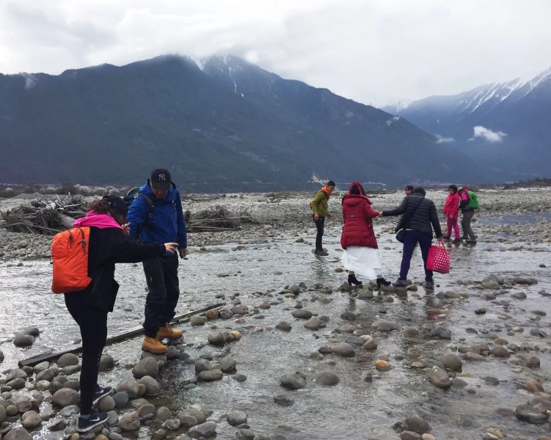 进入波密桃花沟,又一次开启惊呼声浪潮,候鸟领队神秘的说:“看更加深度的桃花队友跟我走”,一段徒步穿越开始了,接着是一段涉水徒步,再继续,河水较深,过不去了,我们遥看了一阵子远山处朦胧的村寨桃花,徒步返回桃花沟景区。