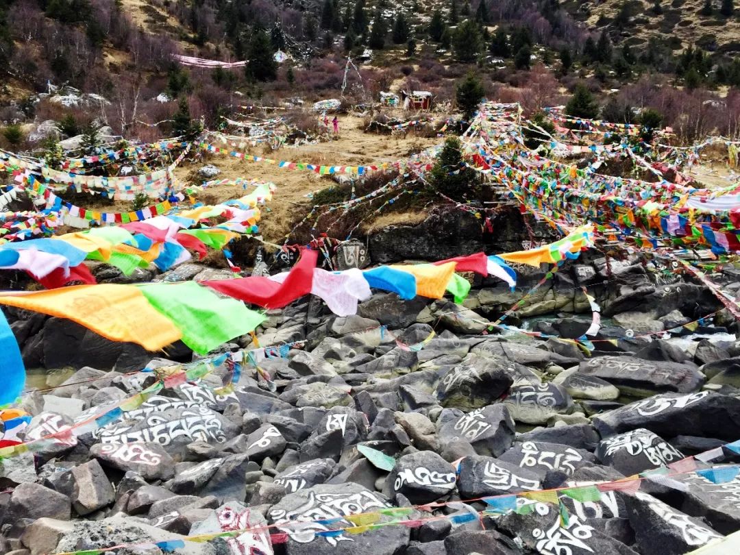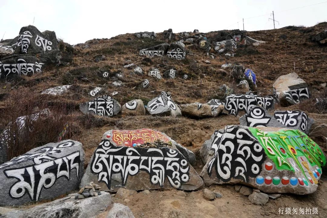沿经石河谷而上,河谷的石头上刻满了祈福的经文,经幡飘荡,散落的经石如低回婉转的音符。