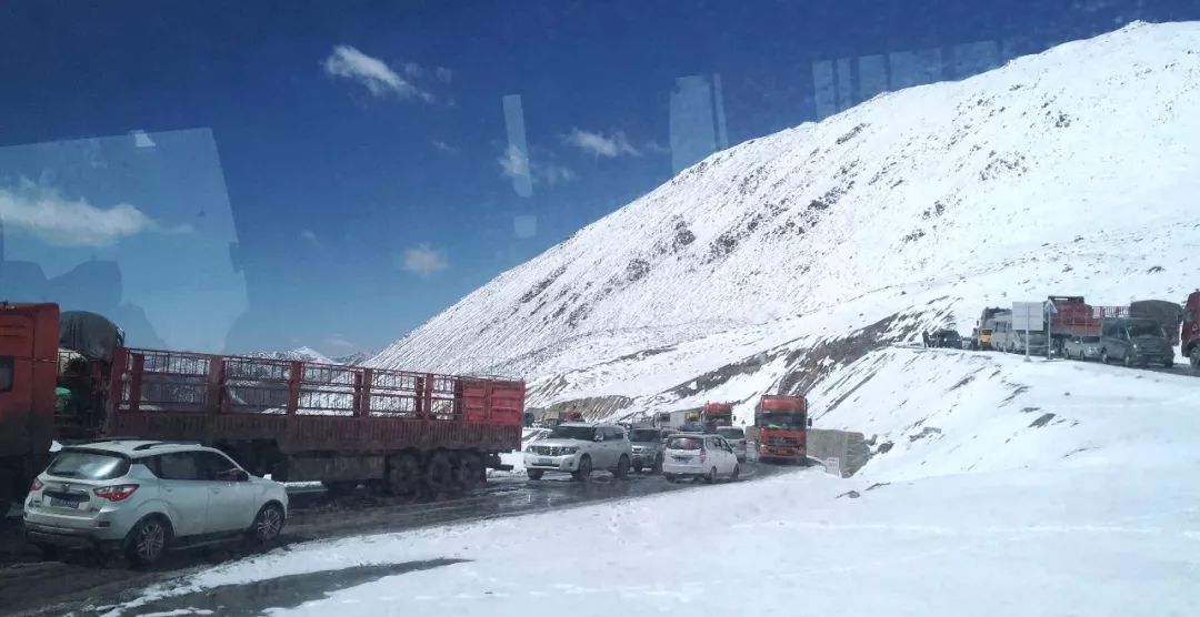 从芒康出发,跨越蜿蜒的澜沧江,翻越川藏线上最高的东达山(海拔超过5008米),山顶道路积雪冰冻,大货车行驶困难,在路上又遇100多辆军等候让行,我们在海拔5000多米的山上滞留了2个多小时,很多人的脸部开始胖了,我也感觉脸部发热,心跳加快,安静的坐在车上不敢乱动。