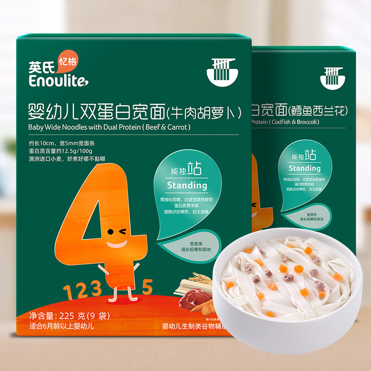 英氏忆格这款宽面,特别添加双蛋白,适合作为断奶期宝贝的营养补充,加上牛肉+胡萝卜、鳕鱼+西兰花的荤素搭配,营养更丰富,宝贝更好吸收。