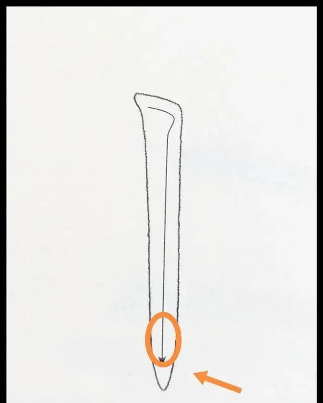 所以,切笔入纸的部分就形成了一个角度,能把这个角度的轮廓写好了,才不算败笔。竖画也一样,切笔入纸也是笔锋轻轻向左下落笔再折锋向右顿笔,然后再铺笔向下缓行。见下图。