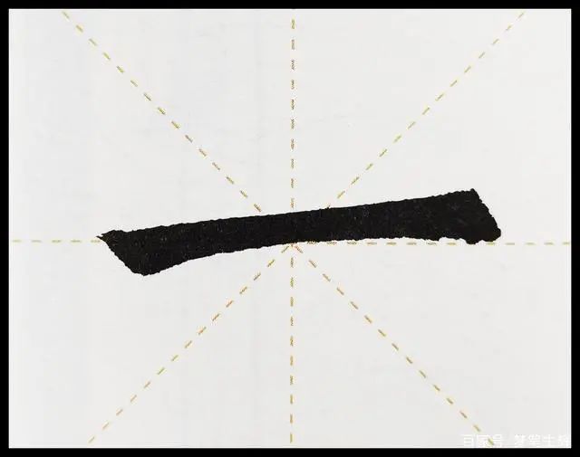 这是很多初学者常见的败笔之处。写毛笔字与写硬笔书法是有所区别的,这种区别就是切笔入纸角度严肃性不同,硬笔书法,要求不高,但毛笔不一样。比如长横画,切笔入纸的角度是45℃左右比较合适,如下图横画。而且,切入过程是先轻后重,顿笔折锋后再向右铺笔,然后中锋行笔。