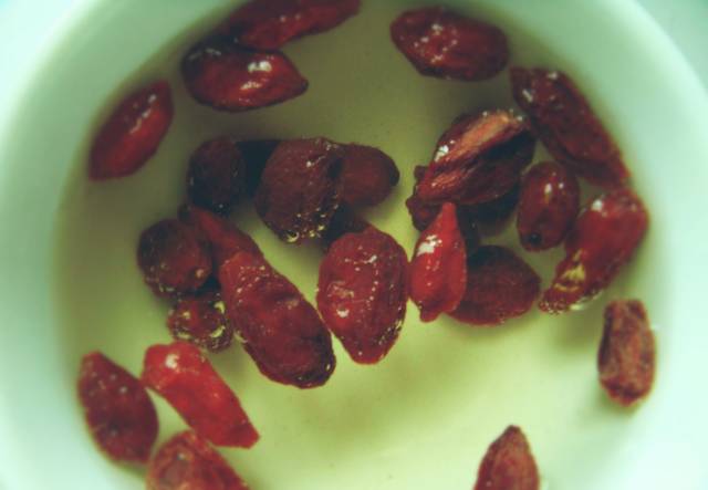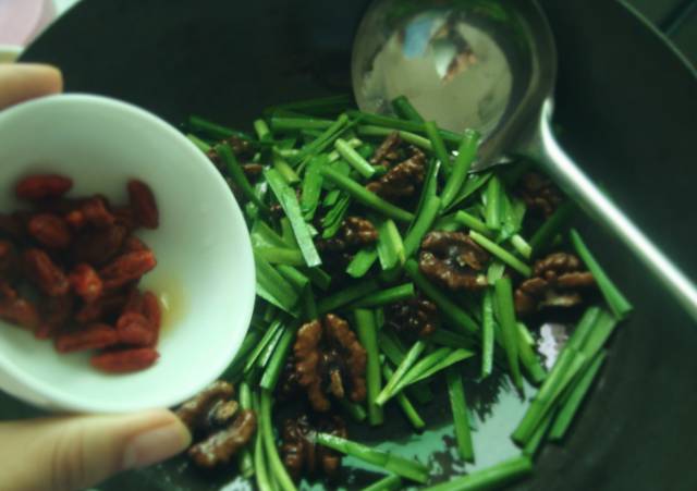 3、闻到韭菜香味时,倒入枸杞,大火翻炒;