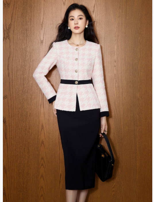 在秋冬职场的穿搭竞技场里,如何既能彰显专业态度,又能绽放女性独有的优雅魅力?这套粉色千鸟套装,便是为追求轻奢质感、渴望塑造“女神范”的职场女性量身定制的答案