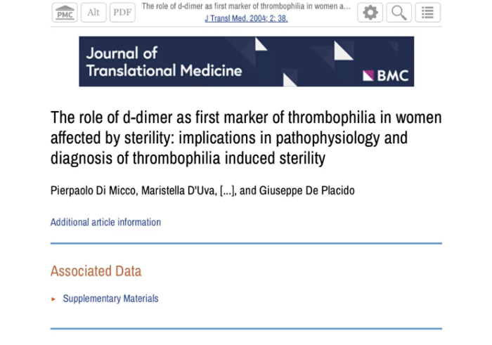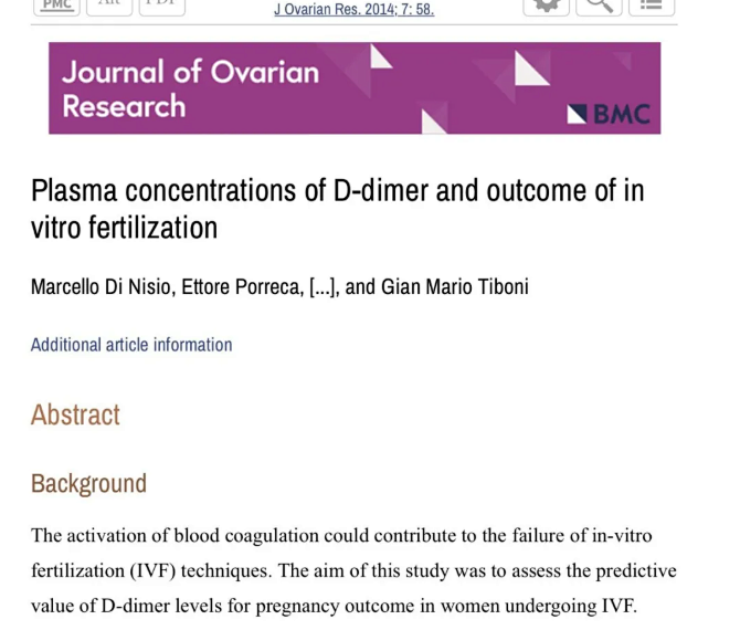 另一篇标题是:血浆中D2聚体值和试管受孕结果的关系。文章研究了105位做试管的女性的D2值,发现D2值高的人试管成功率显著低于D2值正常的人。