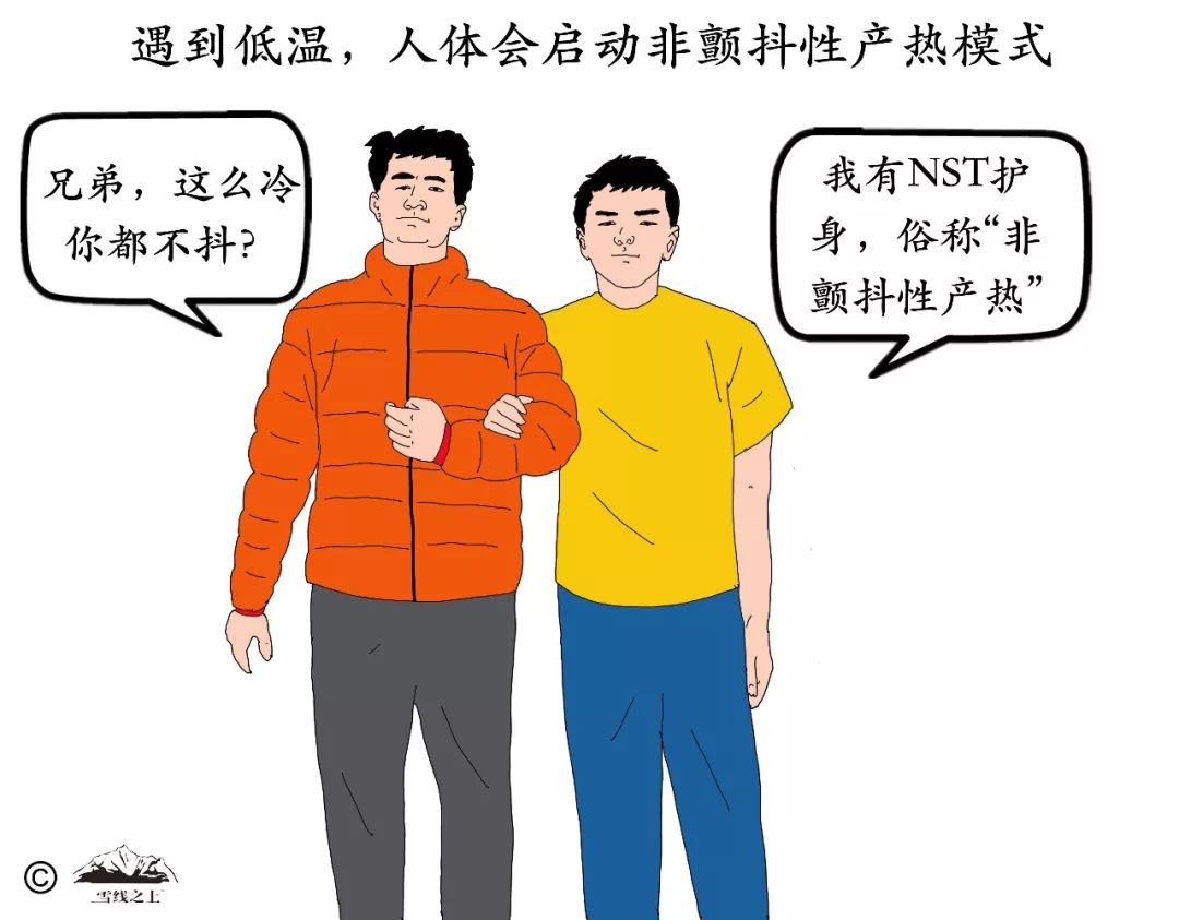 基础产热(基础代谢率)、寒冷时产热(非颤抖性产热)、颤抖产热(颤抖性产热)是人体的三种主要产热机制,如果你有一项或者两项高于他人,就会更抗冻。