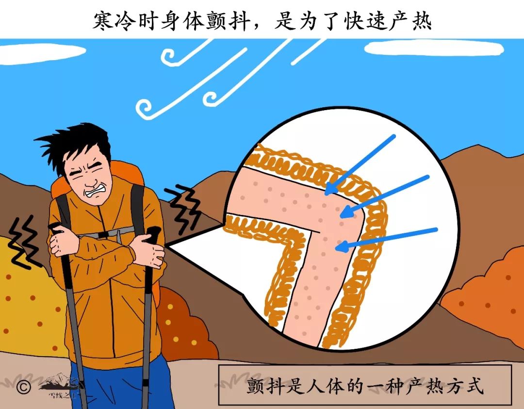 如果外界持续寒冷,身体就会调动更大的力量产热,表现就是颤抖。颤抖产生热量的多少每个人是不一样的,肌肉多的人,颤抖时候产生的热量就多,也就会更抗冻。