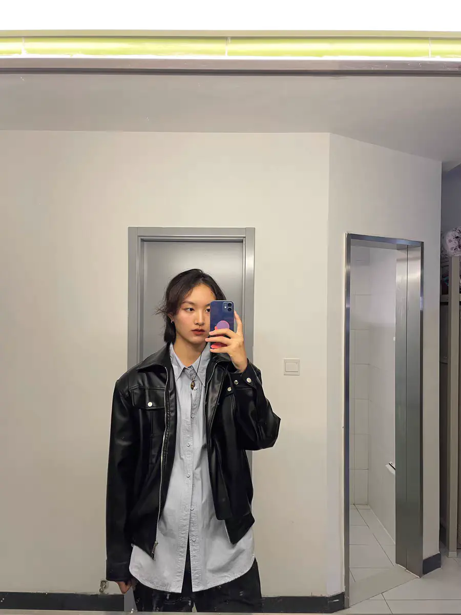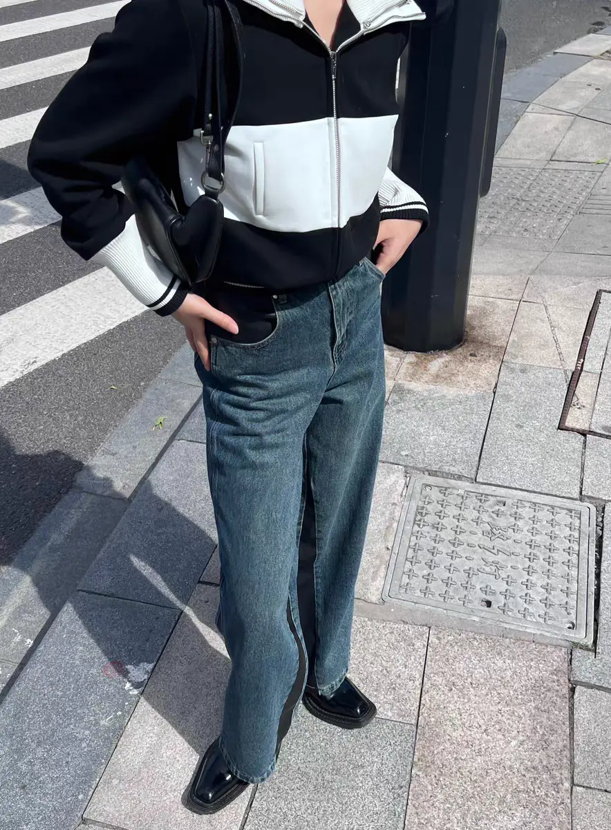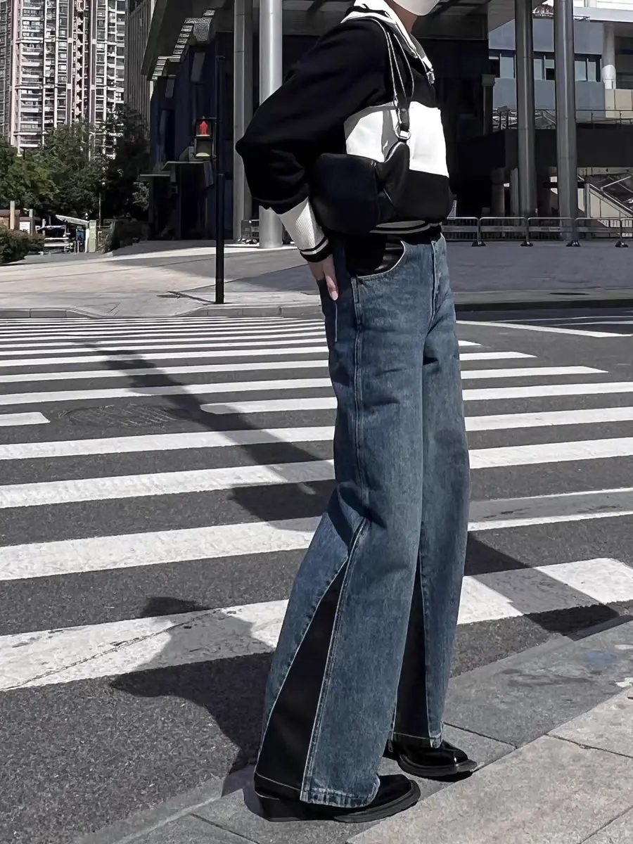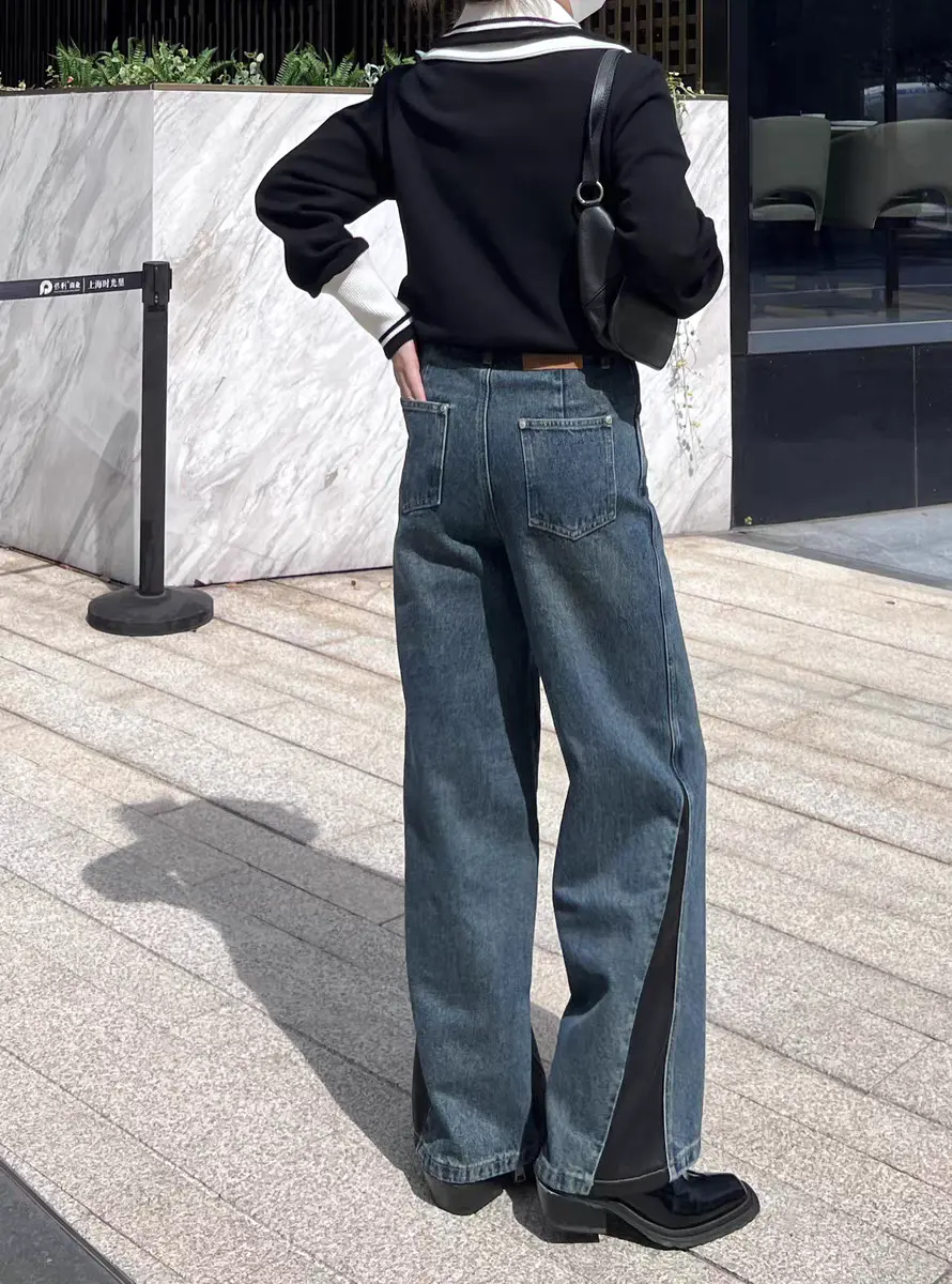 “撕裂黑暗的黎明”皮拼接牛仔裤