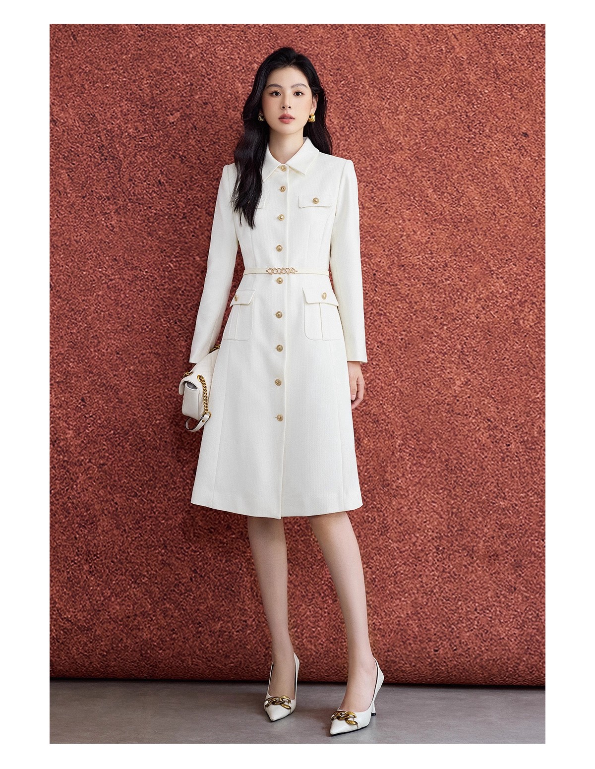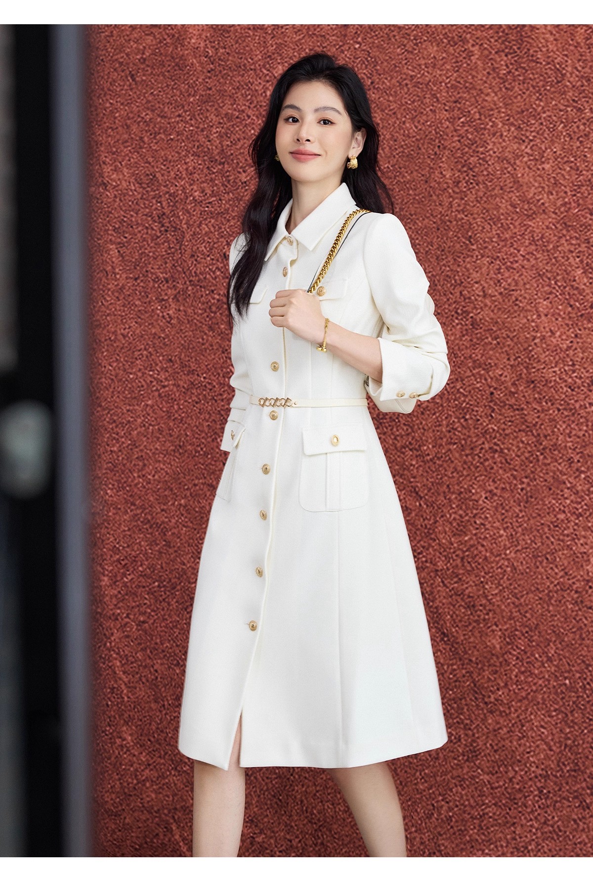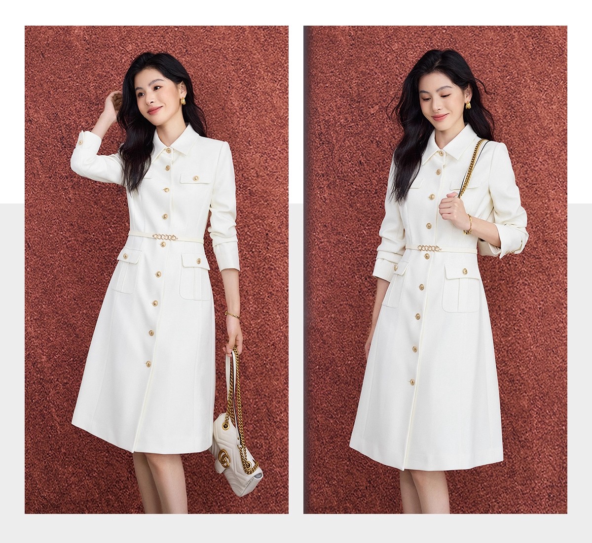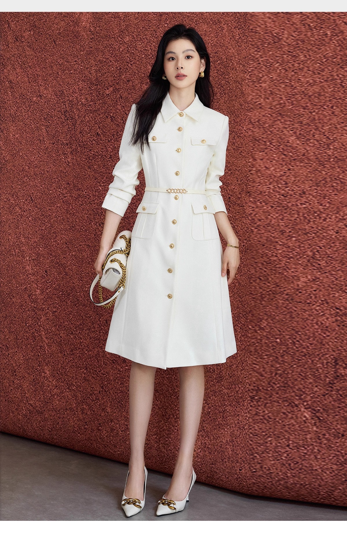 🔘 金色纽扣与金属腰带的搭配,是复古与时尚的碰撞,让简约的白色不再单调,反而多了几分轻奢质感~