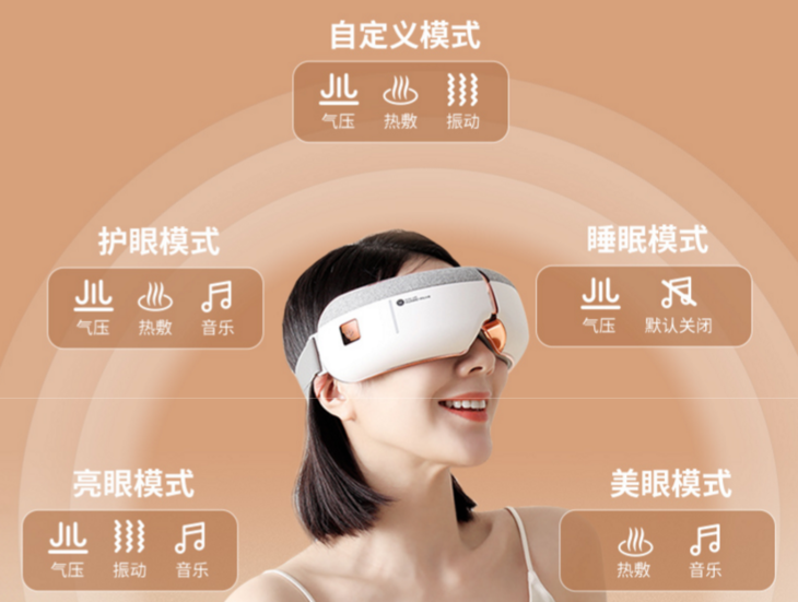 护眼模式:15分钟热敷+气压+音乐,适合日常呵护;美眼模式:15分钟热敷+音乐,帮助护肤品吸收;晚安模式:15分钟气压,轻柔按压,放松肌肉更好睡;