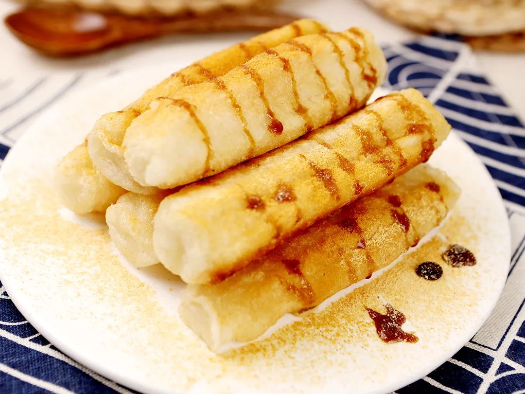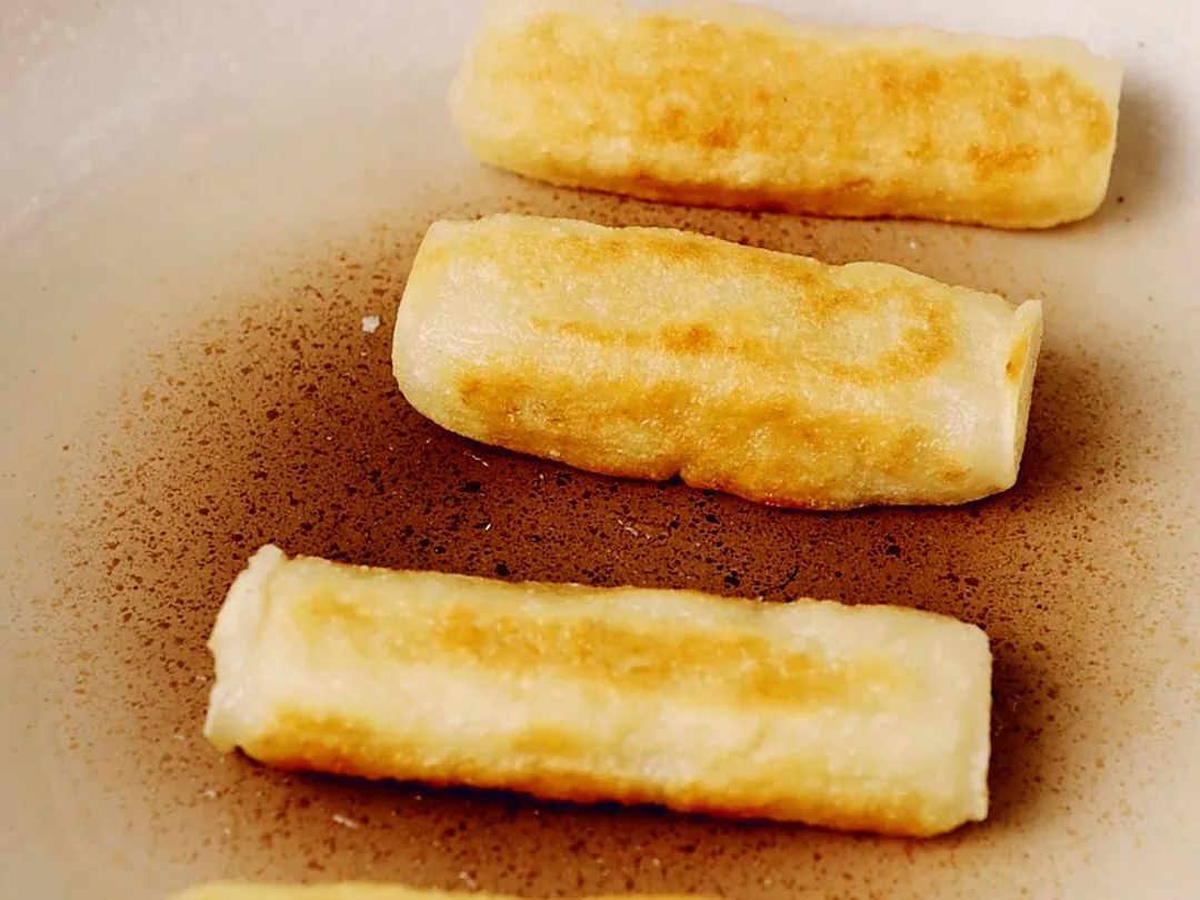 3.平底锅中加入少量食用油,油温温热后放入糯米条,煎至四面金黄即可出锅;