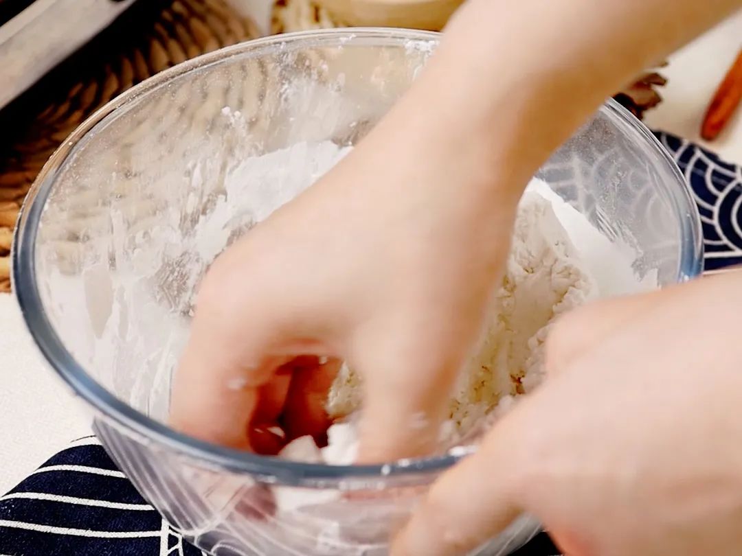 1.糯米粉倒入碗中,加入大约70度左右的温水,先搅拌絮状,然后揉制成光滑的面团