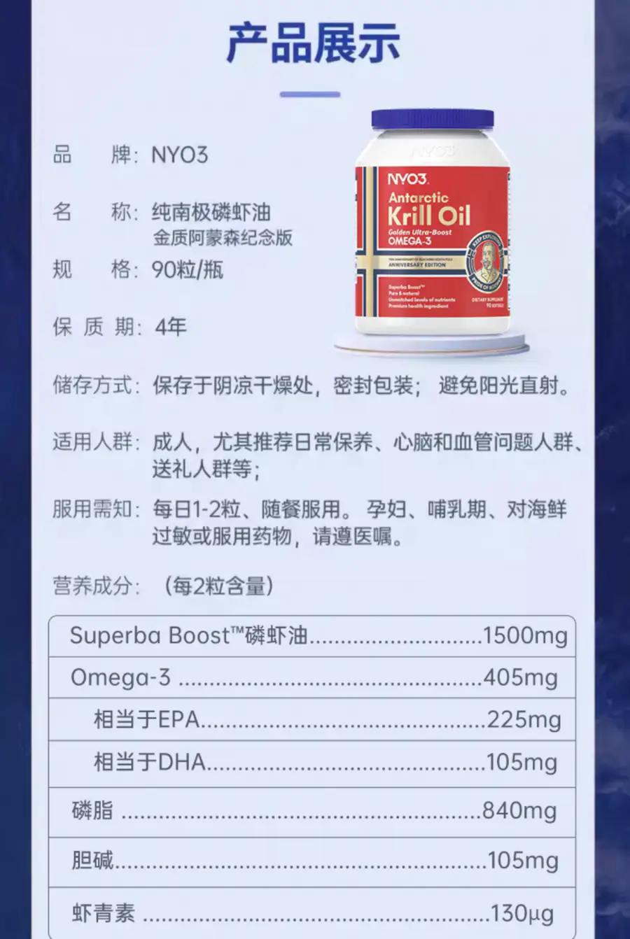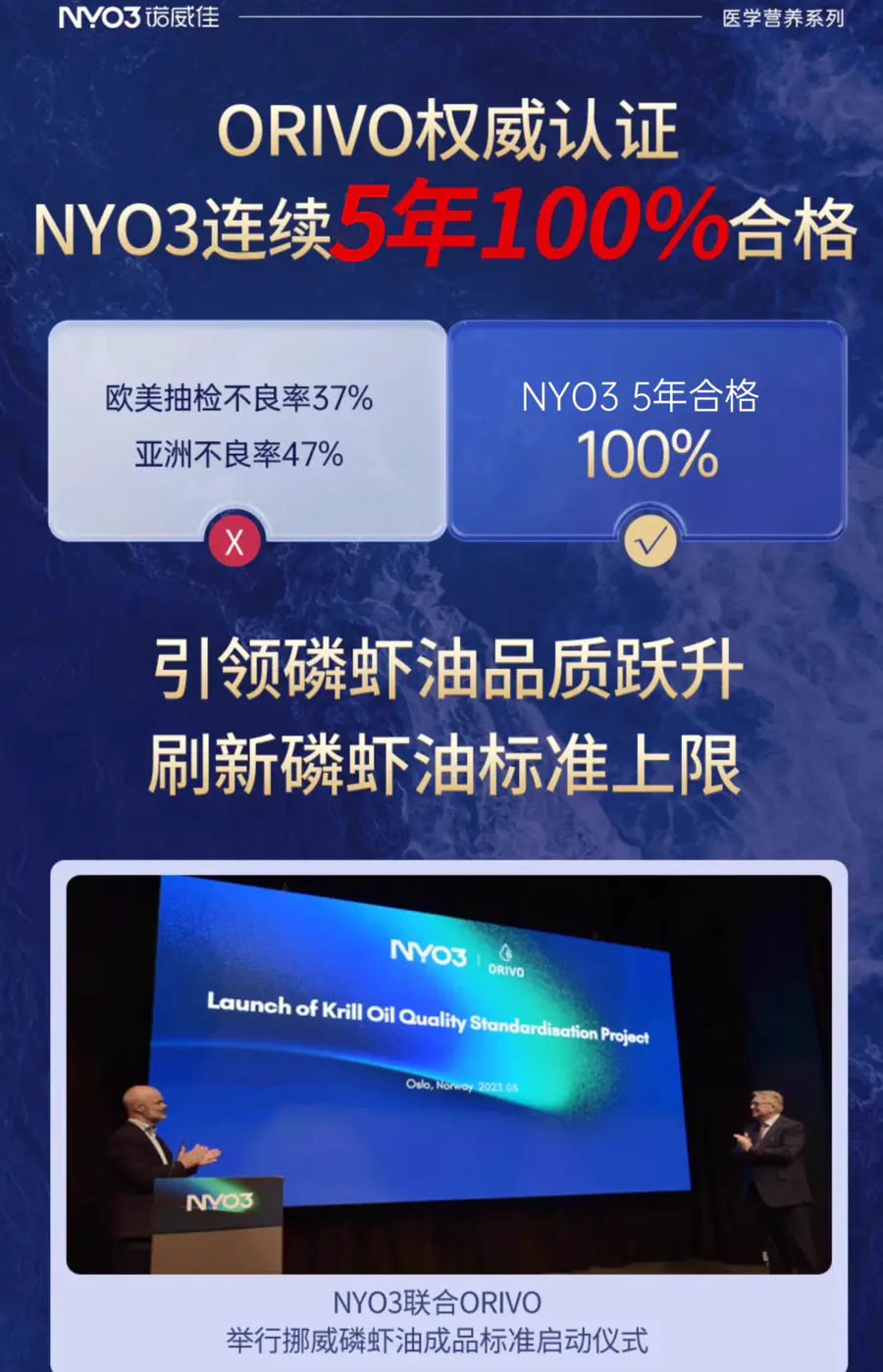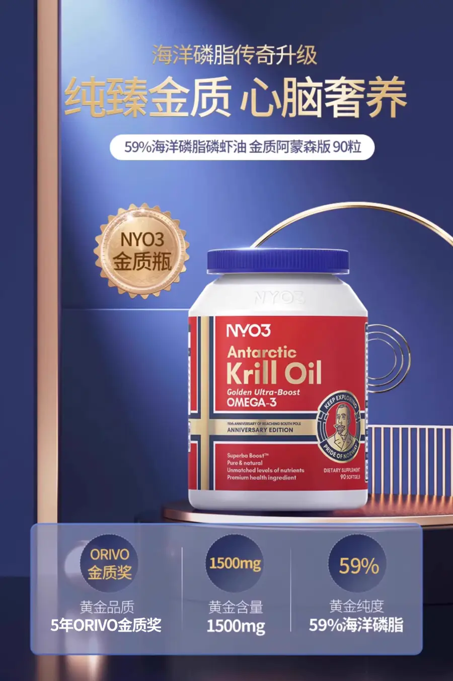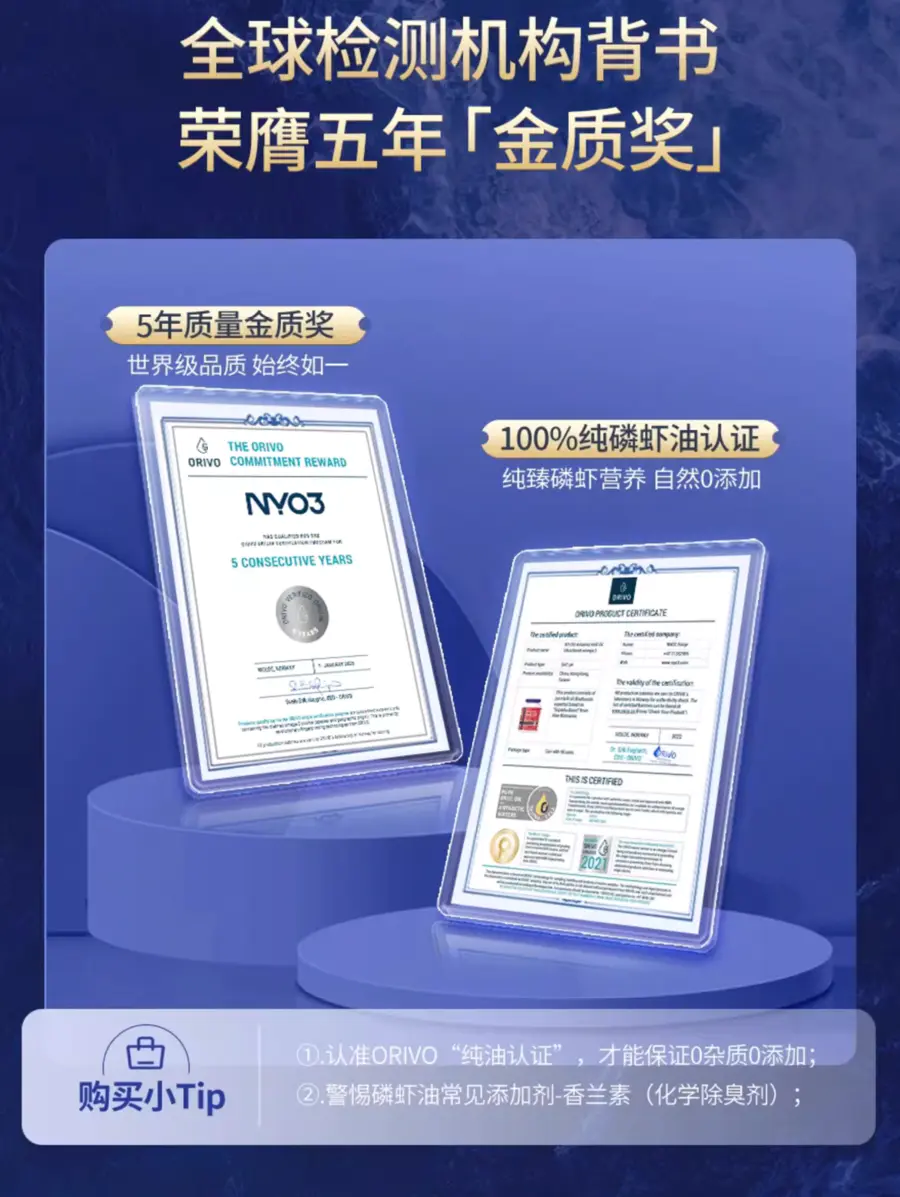 NYO3阿蒙森磷虾油,手握Orivo金标100%纯油认证、Orivo5年质检0缺陷、国际蒙特金奖等众多权威认证!