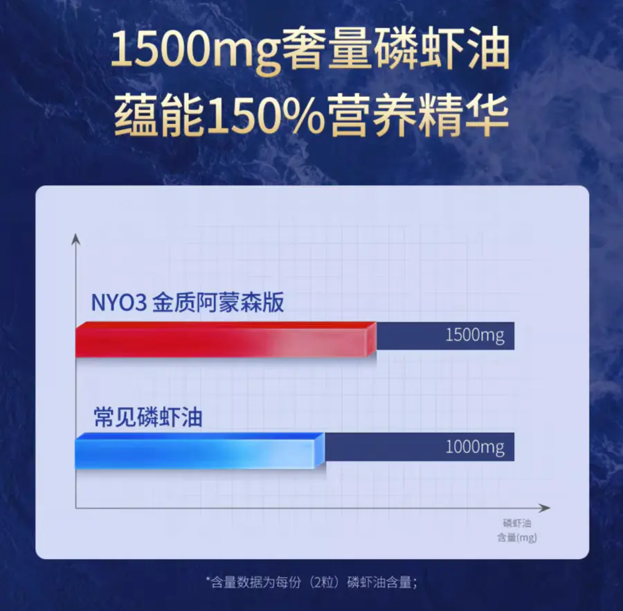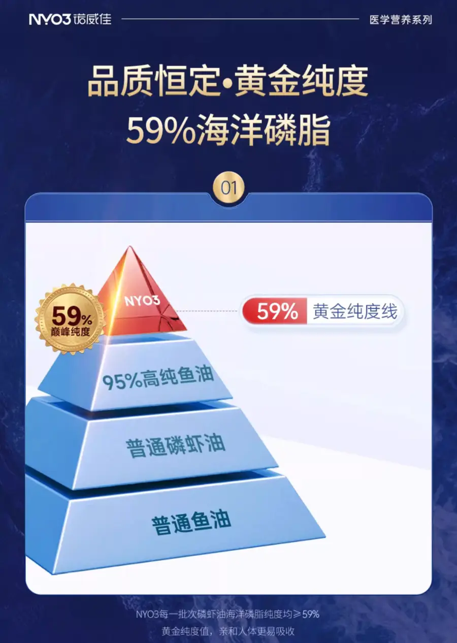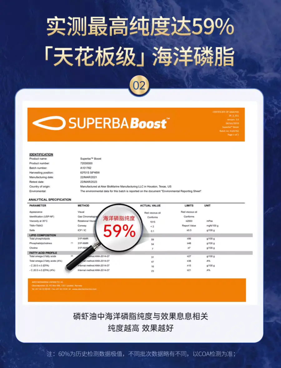 NYO3阿蒙森磷虾油海洋磷脂大于等于56%,实测为59%,行业磷脂含量“天花板”。