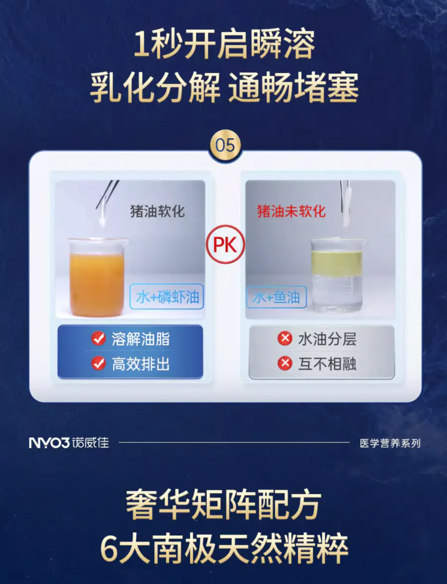 磷虾油中的磷脂也是天然的乳化剂,能将脂肪分散为微小颗粒,促进脂溶性物质(如 Omega-3)的溶解和吸收。