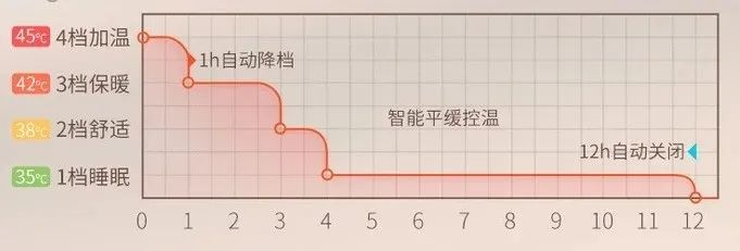 即使你在睡觉时候开到最高的4档,它都会随着时间的推移帮你降低档位,最长12小时就会自动断电关闭,即使马大哈睡醒忘记关掉,也不怕会引起火灾。