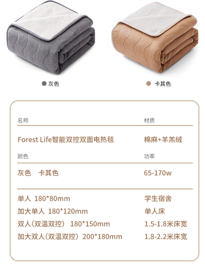 Forest Life电热毯采用的双螺旋发热丝,可以实时控温、绝缘保护、防止自燃。