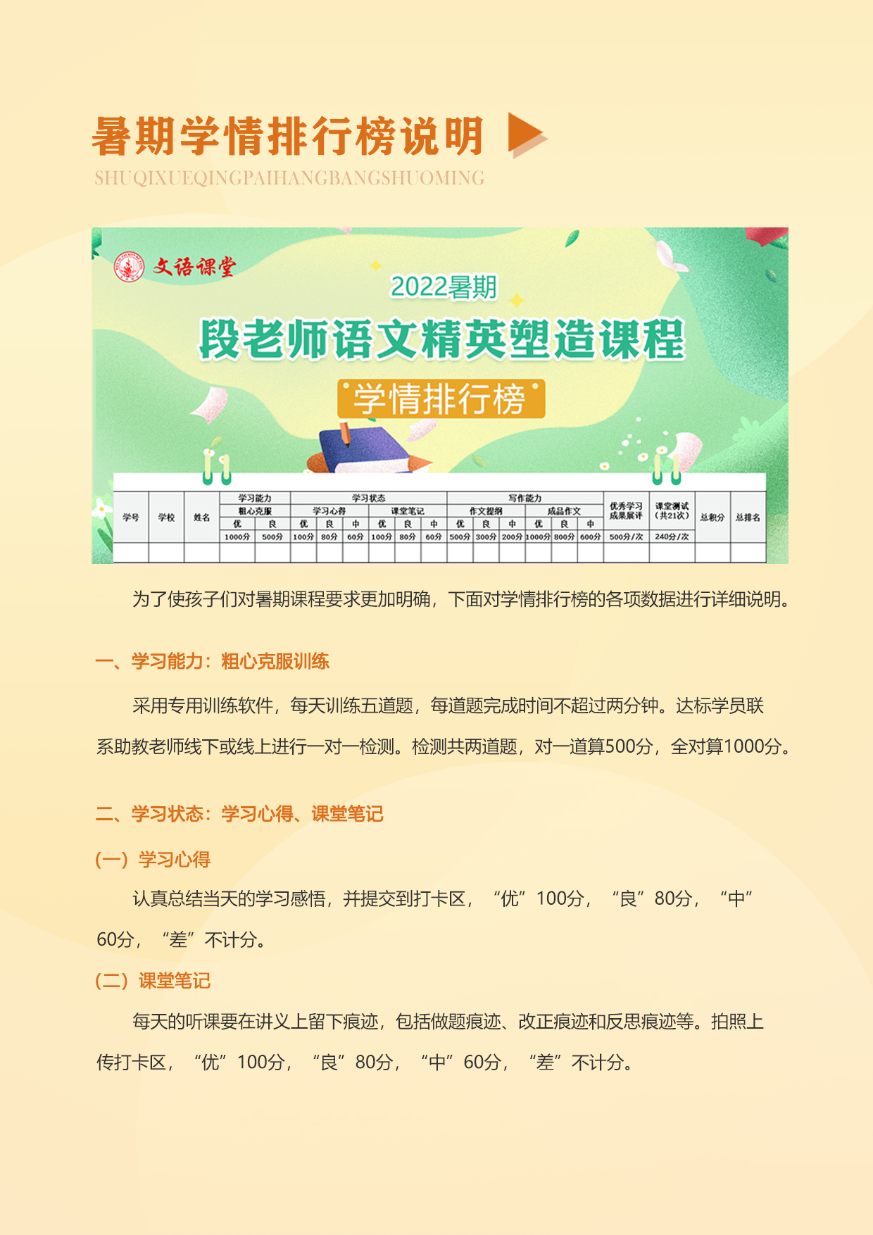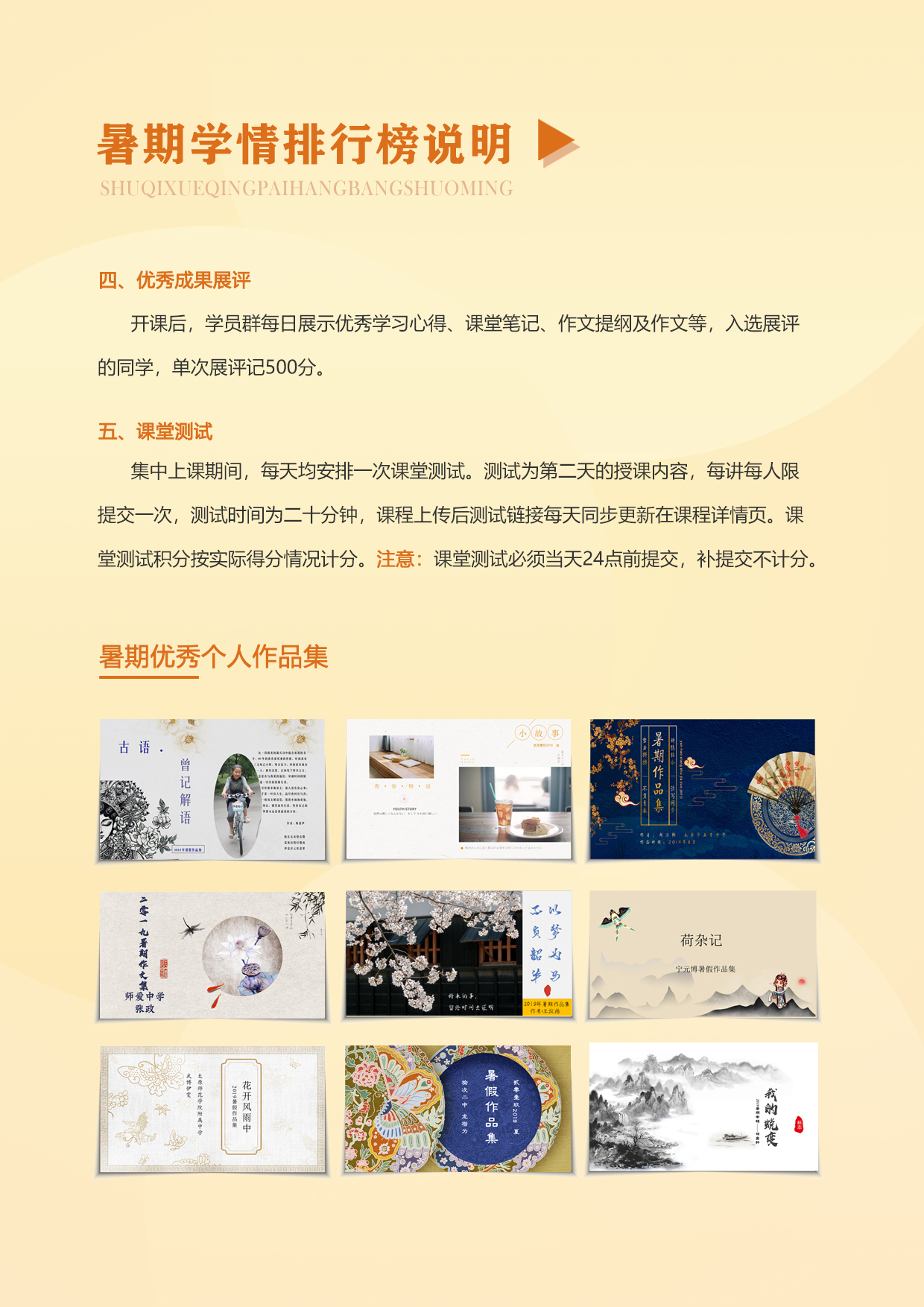 “课堂测试部分”包括基础知识(现代汉语、古代汉语、课外文言、名著阅读)、经典母题、提纲诊断三大部分。每份讲义包括12道选择题,每题20分。今天做,明天讲。学习心得、课堂笔记要求拍照上传打卡区(打卡链接开课前发在各班级群);测试分数计入学情排行榜;