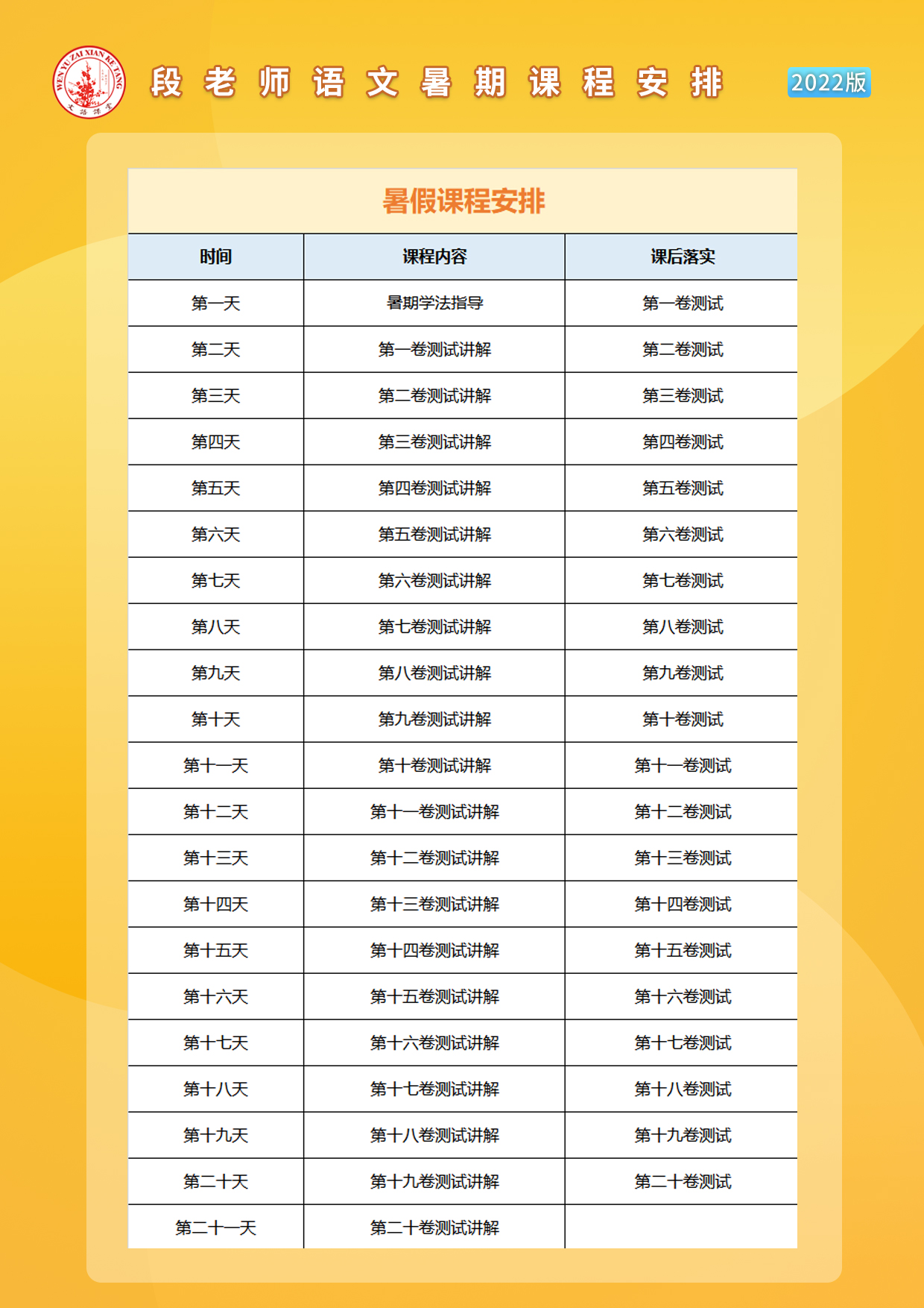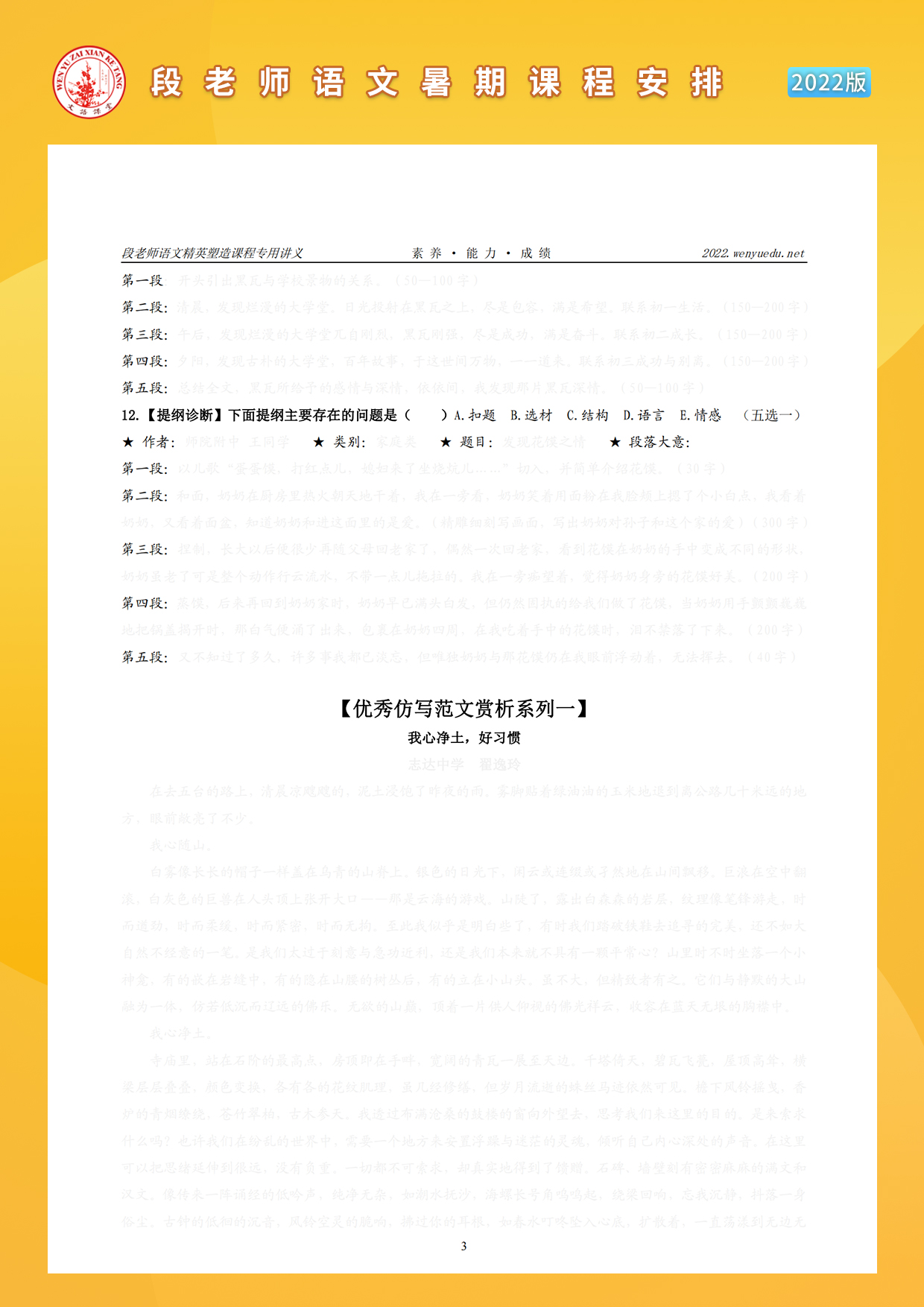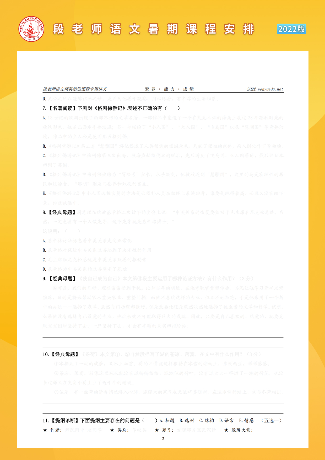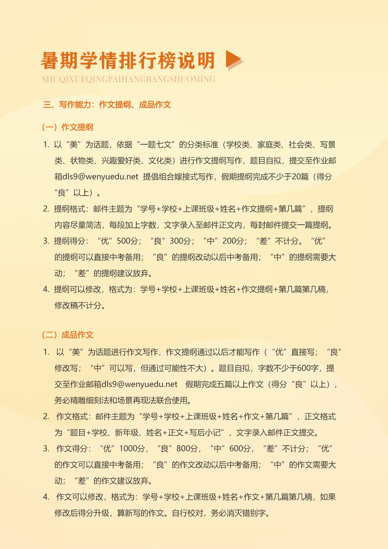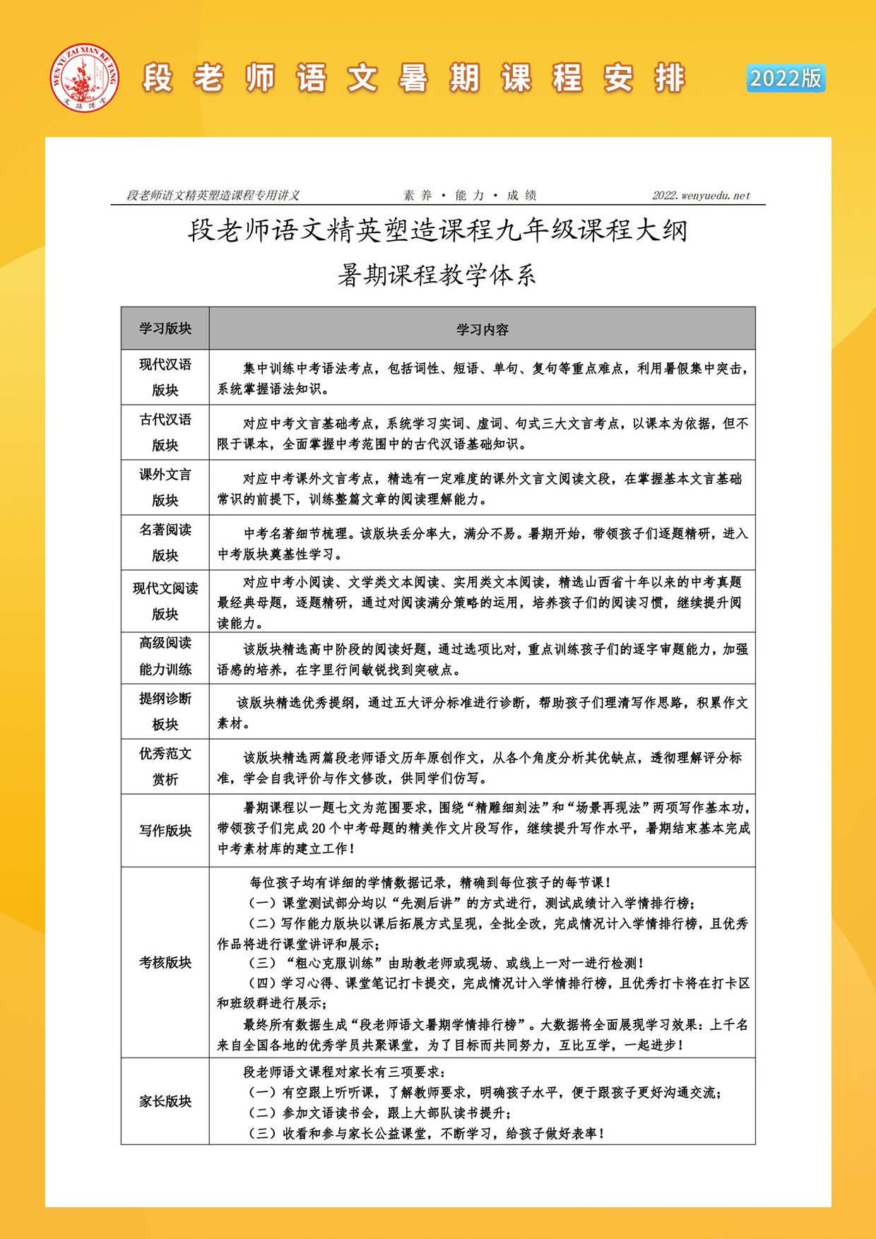 九年级暑期课程第一讲为学法指导,后面的每讲学习内容均包括“课堂测试”和“提纲作文赏析”两大部分。