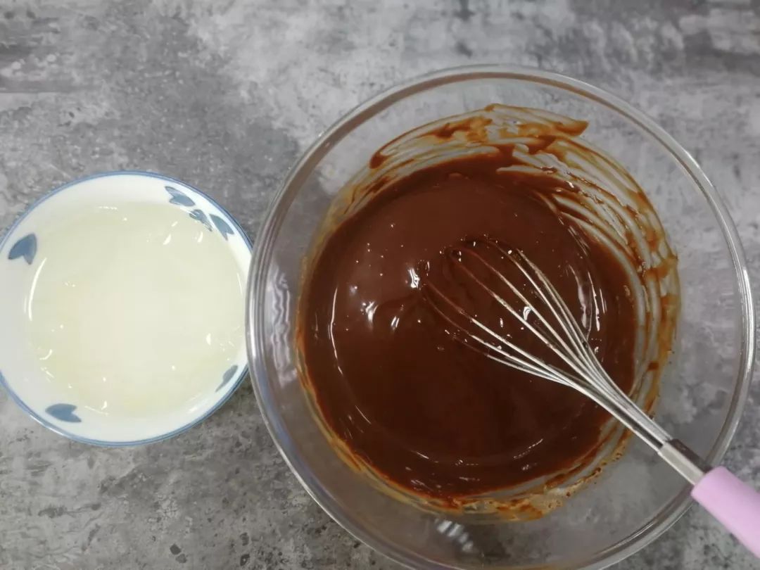 巧克力全部融化,加入泡软的吉利丁片,搅拌均匀;