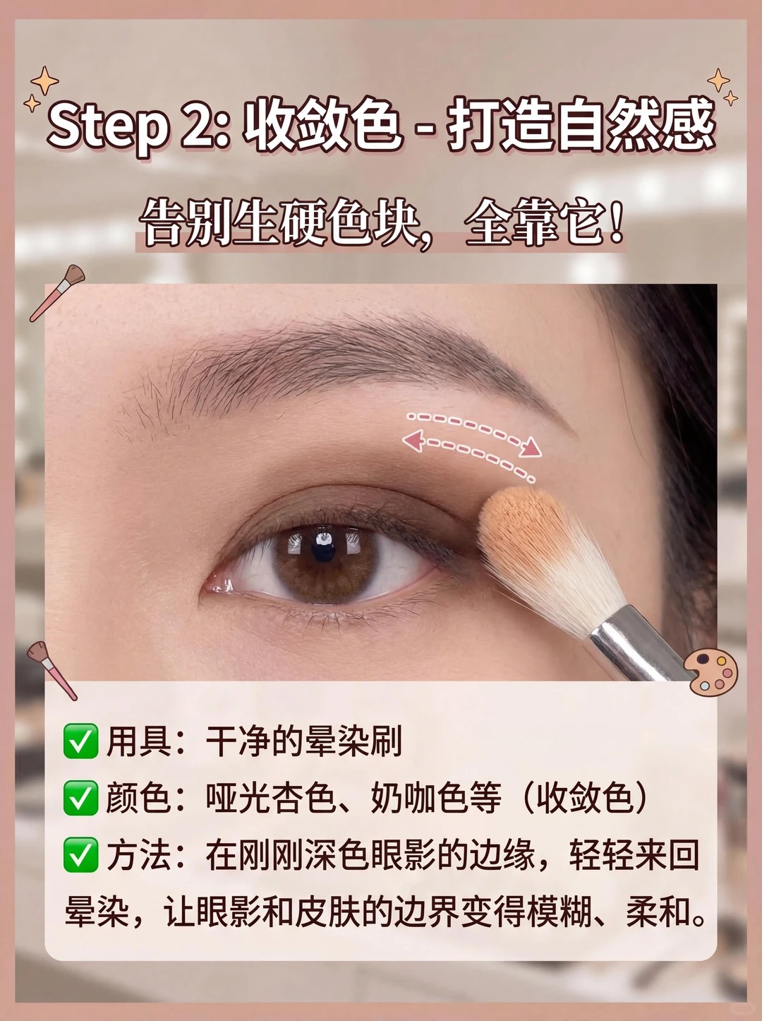 用奶咖色(收敛色)晕染刚才深色眼影的边缘,让它和我们的肤色完美融合,告别尴尬的色块感!