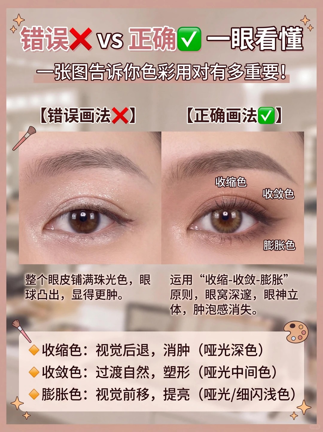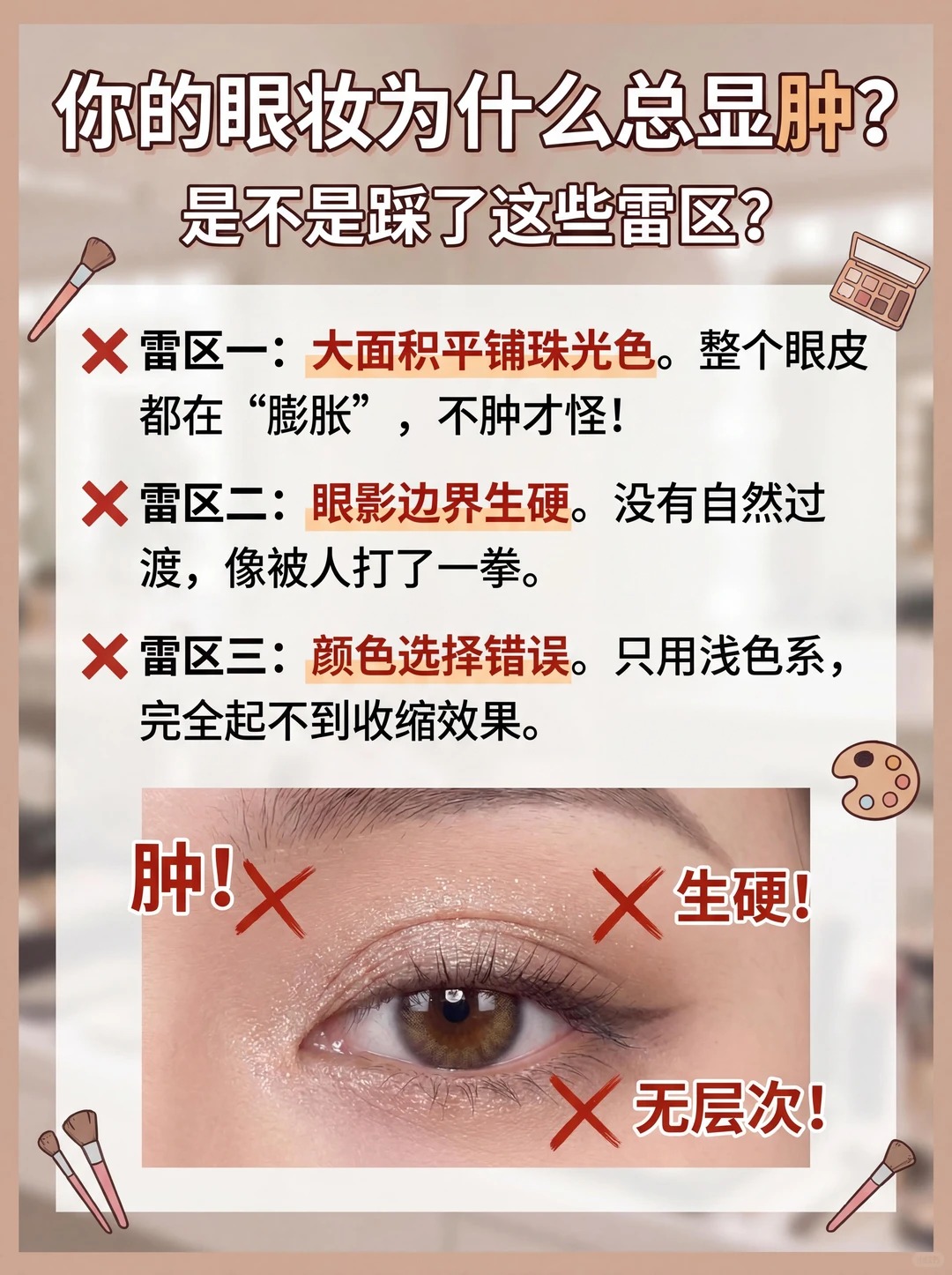 ❌ 肿眼泡雷区: 千万不要大面积平铺珠光膨胀色!那样只会让你的眼睛看起来像刚被蜜蜂蜇过!🐝