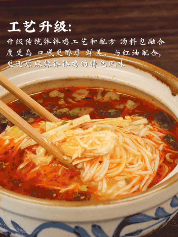 传统的钵钵鸡主要以菜品为主;钵钵鸡米粉则是以米粉为主,还原了钵钵鸡麻辣鲜香等特点。