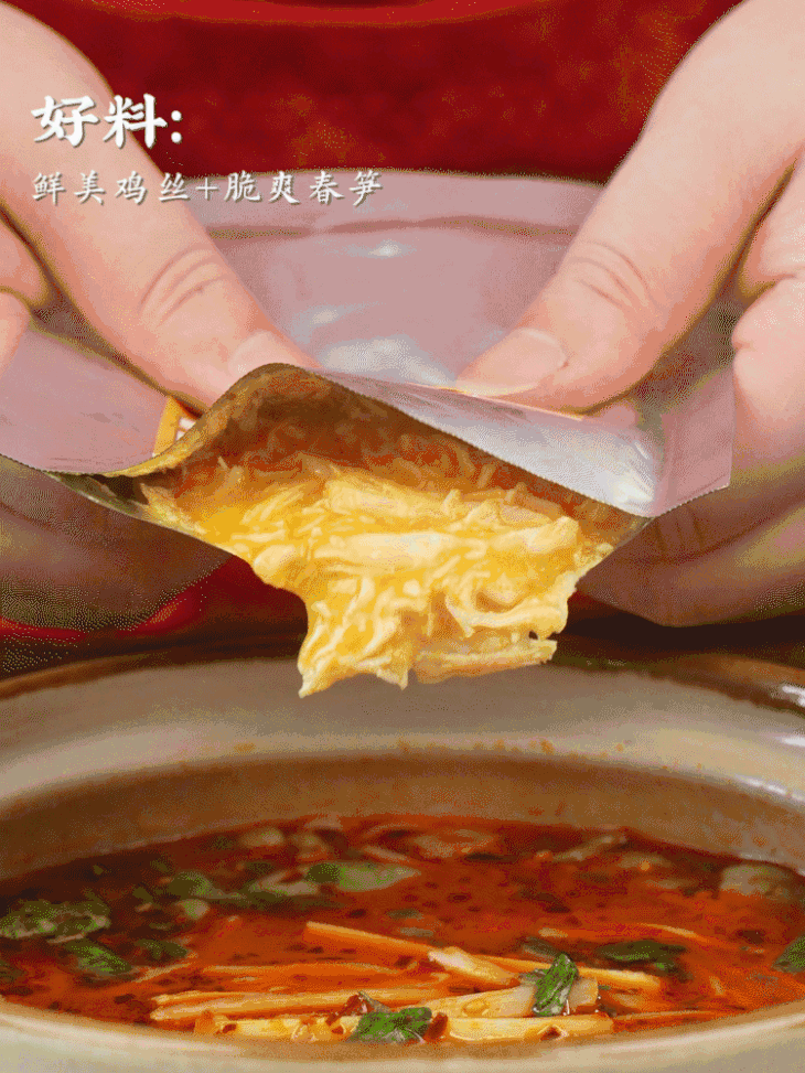 配料包可是下足了功夫,钵钵鸡米粉除了粉外的重点是什么,当然是鸡!有一整包鸡肉和鸡汤,开袋就能闻到鸡汤的香味。