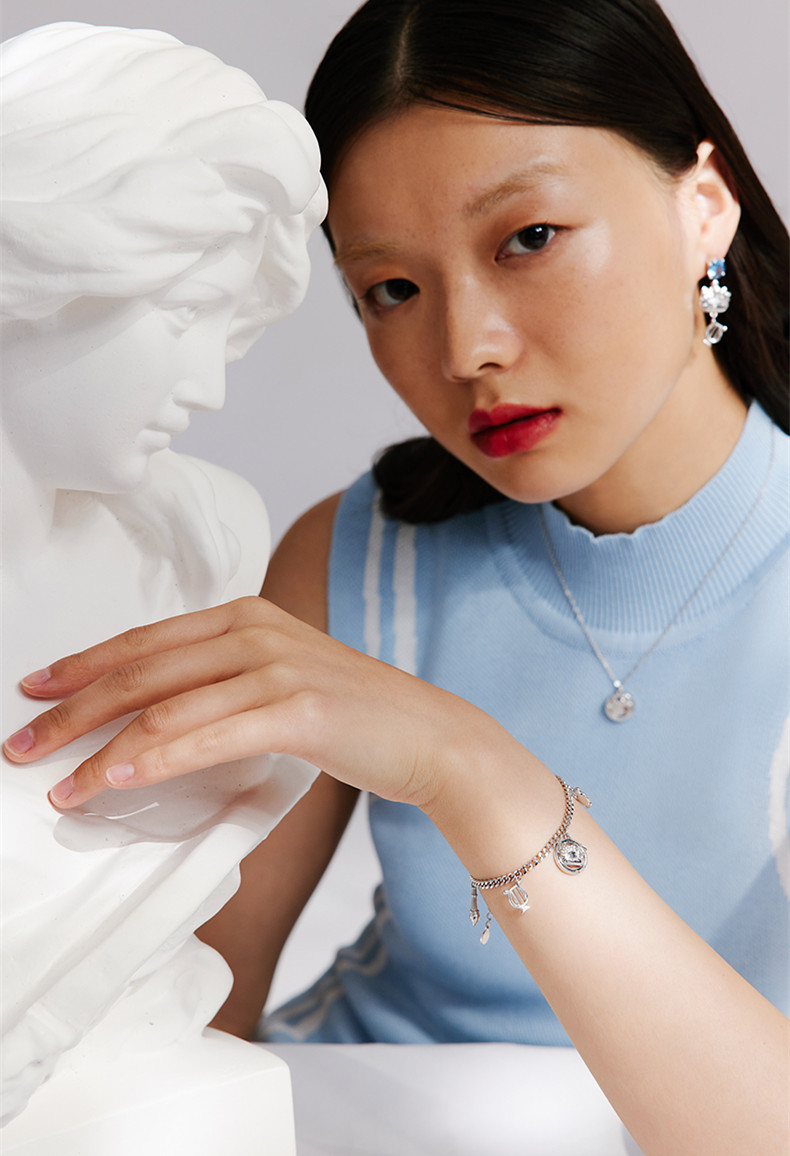 璀璨蓝锆仿佛群星在天边闪烁,火炬、竖琴、陶罐元素,唤醒人文主义回归。雕塑陷落成零散遗迹,厚重文明被重新解构。但奥林匹亚精神在吉光片羽间重现于世,永不熄灭!