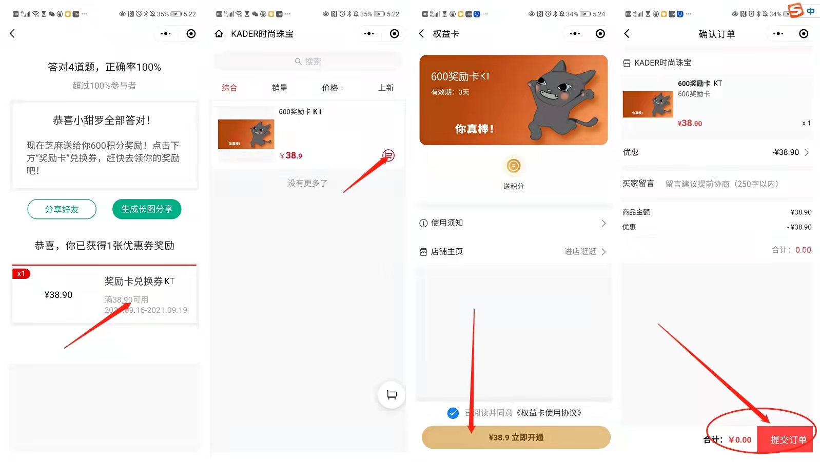 另外,积分权益卡是免费领取的哦,答完题的小伙伴们点击下方奖励卡,将奖励卡加入购物车,点击开通,就能免费领取大额积分啦!快去给你的积分回口血吧!