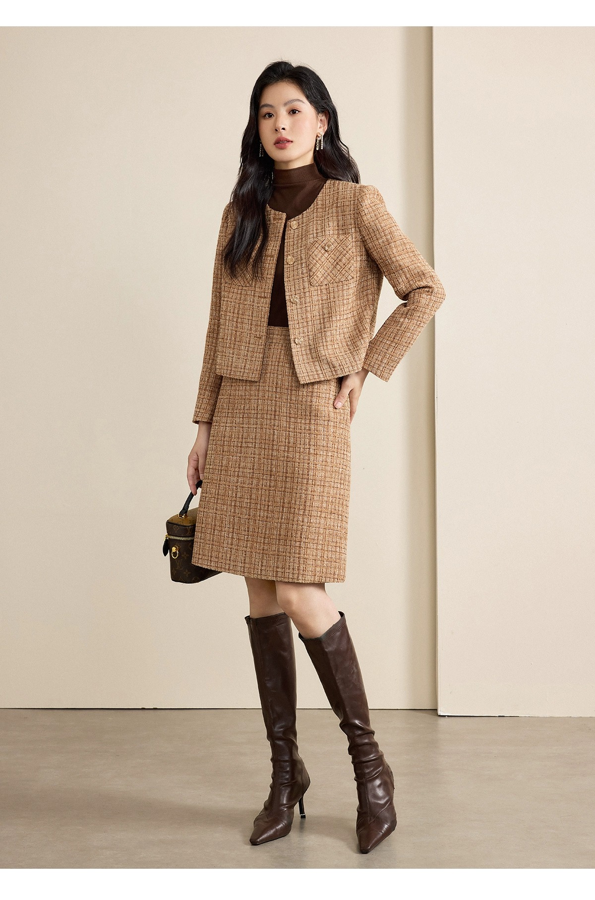 它的魅力,藏在每一处恰到好处的细节里:粗花呢面料自带细腻的肌理感,咖棕交织的格纹像把秋日焦糖裹进了衣料,暖调里透着高级