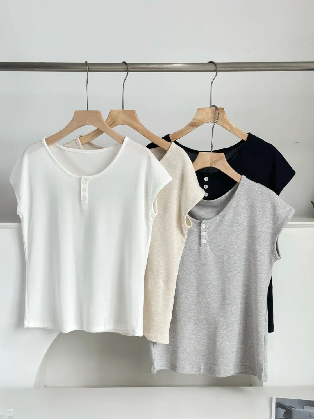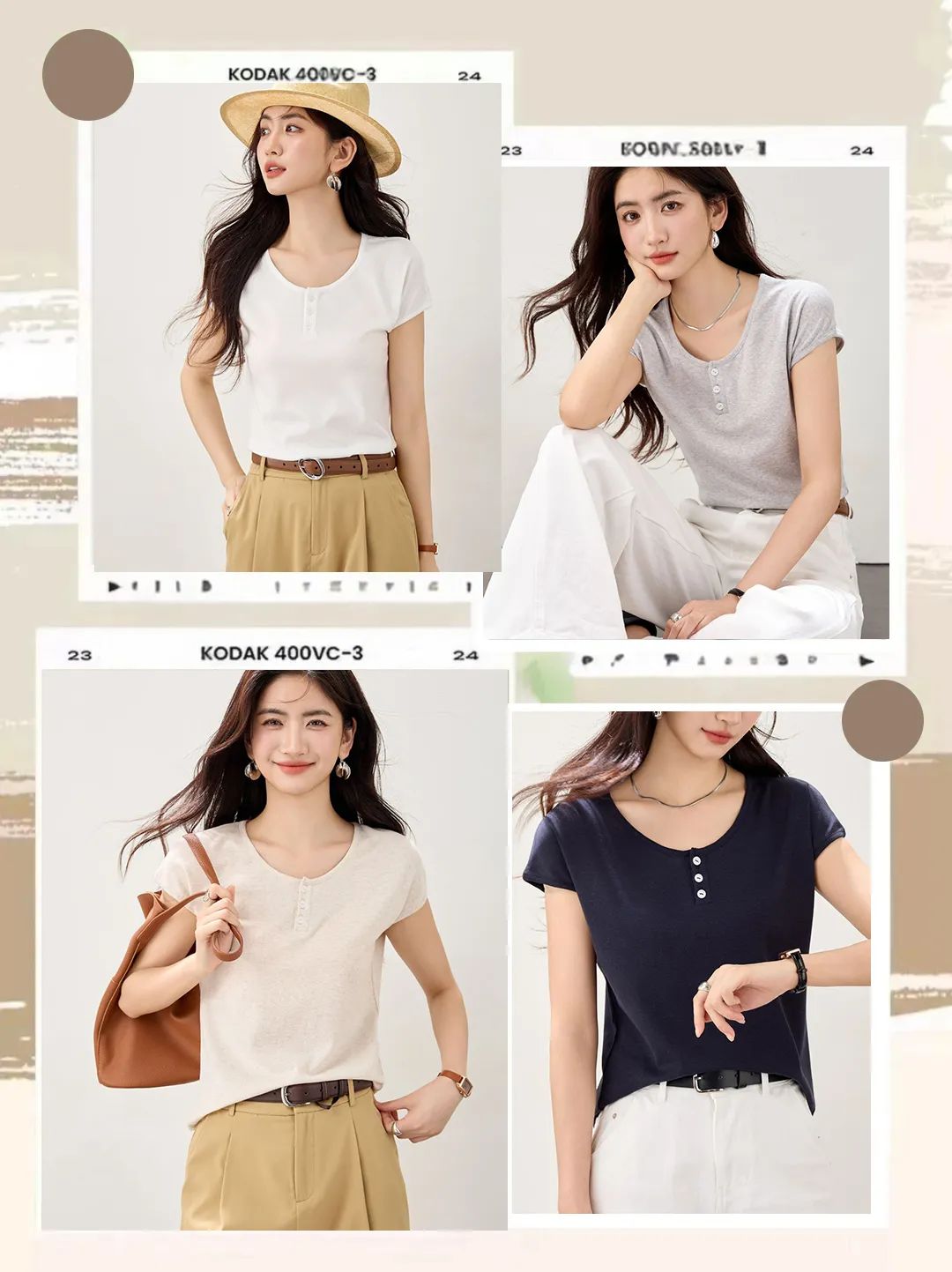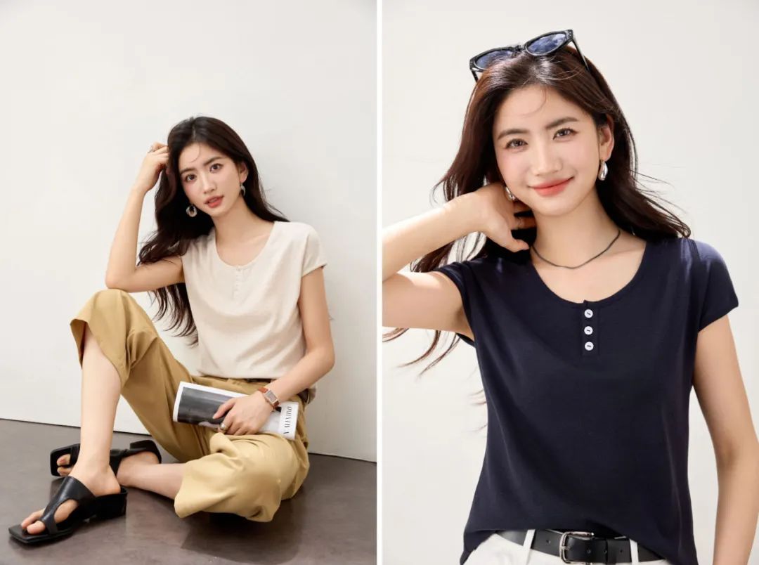 最心机的是领口这排天然贝壳扣,比普通T恤多花3道工序手工钉扣,恰好增添一丝精致感!