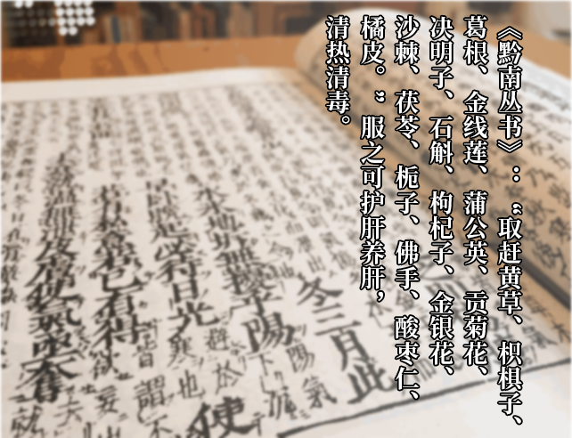 《黔南丛书》中就详细记载了秘方:“赶黄草、枳椇子、葛根、金线莲、蒲公英···等十八味药材,服之,可护肝解毒。”