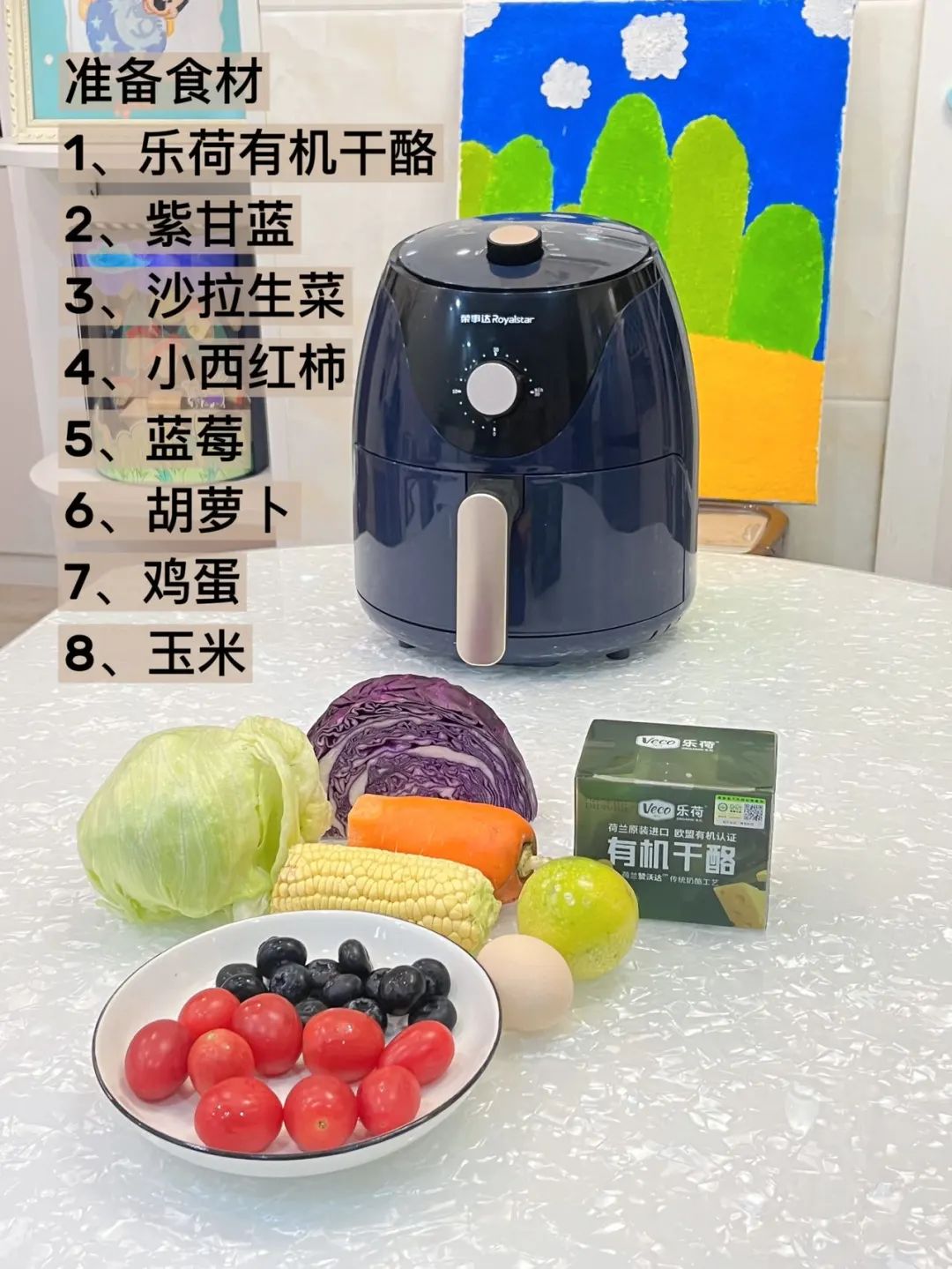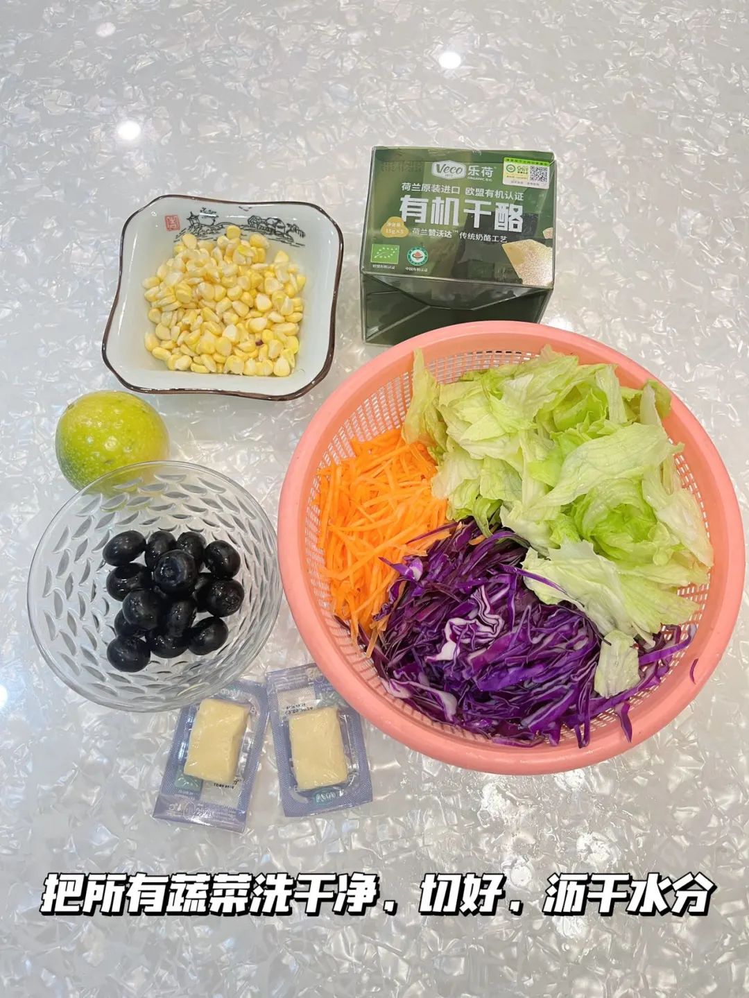 ④ 把蔬菜、胡萝卜、干酪切丝,蓝莓对半切开备用;