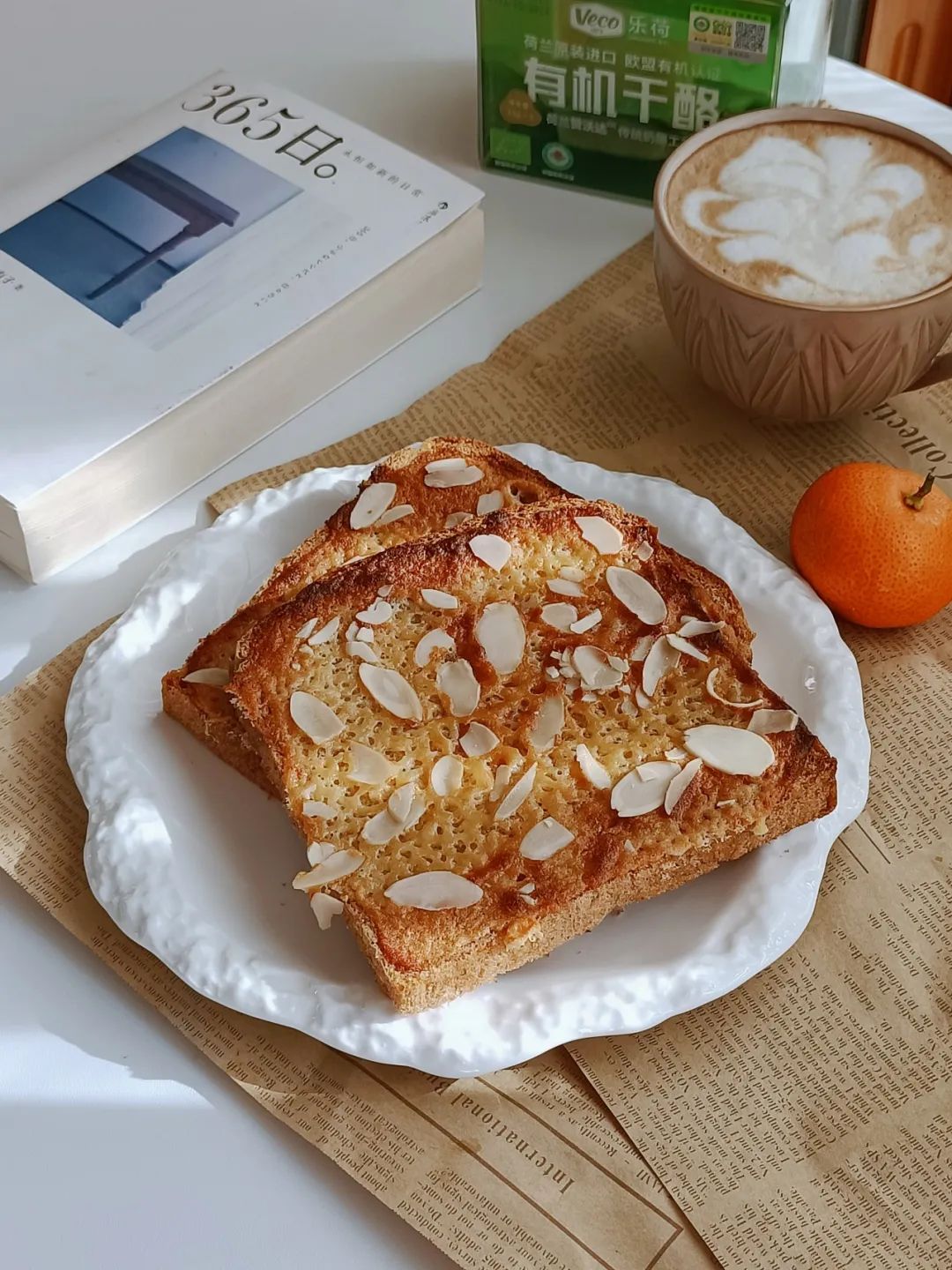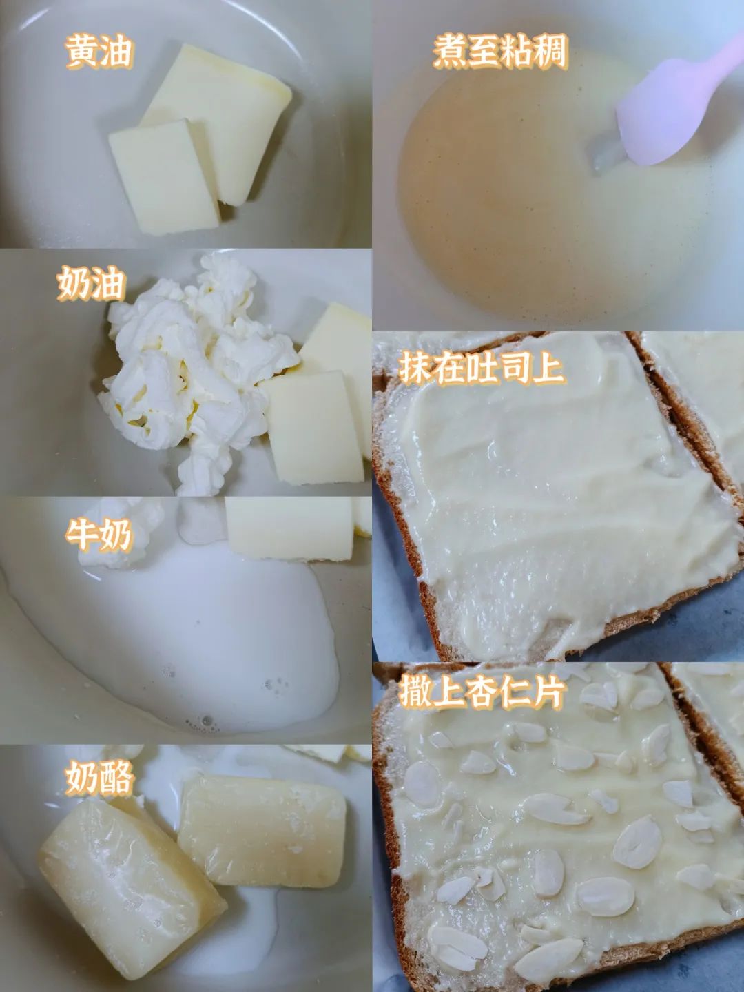 所有材料搅拌均匀,煮至粘稠,铺在吐司片上,175度烤15分钟即可❗(奶油直接用了做蛋糕剩下的,可以换成45g奶油+5g糖)想要口感更好,可以加一点炼乳哦~