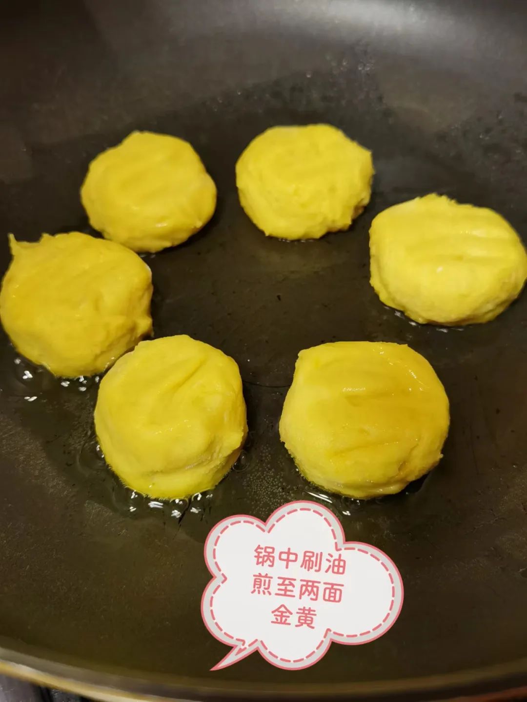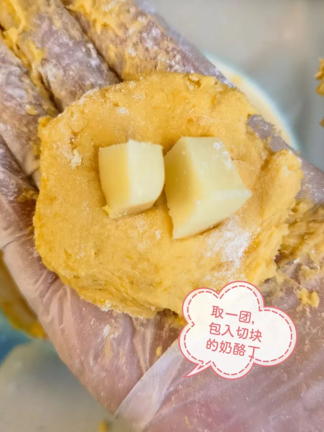 红薯去皮切块,上锅蒸熟,取100g左右,趁热拌入15g奶粉30g面粉(大宝宝可以适当加炼乳增加口感),拌匀后取一团按扁,包入切好的干酪丁,团好后放入刷了油的锅中,煎至两面金黄即可。