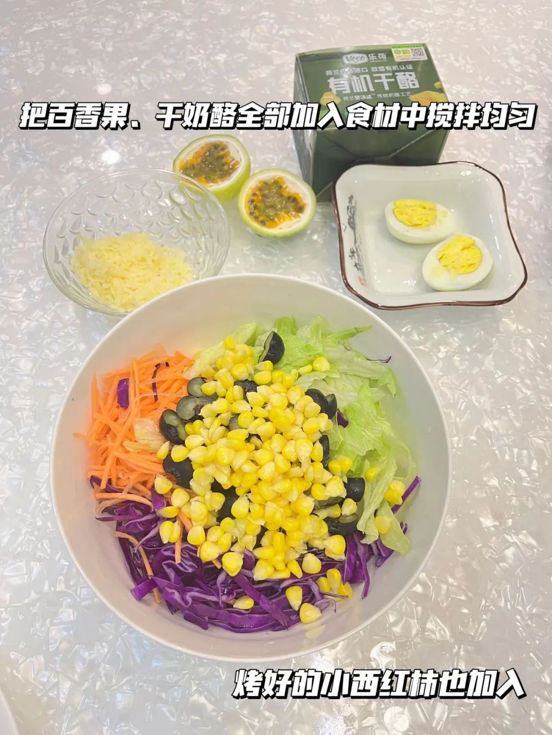 ⑤ 把所有食材放入大碗中,百香果、干酪搅拌均匀,装盘加上鸡蛋。